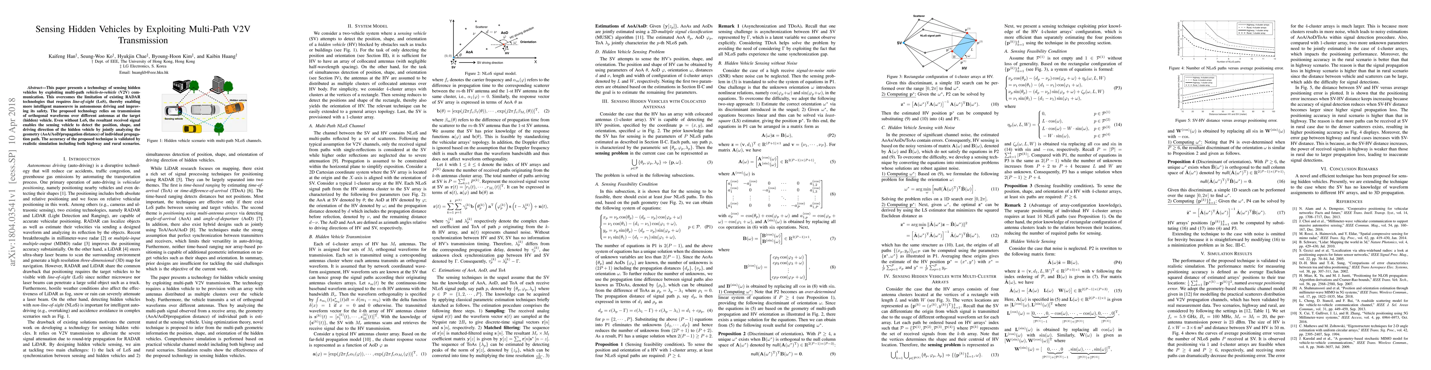 This paper presents a technology of sensing hidden vehicles by exploiting multi-path vehicle-to-vehicle (V2V) communication. This overcomes the limitation of existing RADAR technologies that requires line-of-sight (LoS), thereby enabling more intelligent manoeuvre in autonomous driving and improving its safety. The proposed technology relies on transmission of orthogonal waveforms over different antennas at the target (hidden) vehicle. Even without LoS, the resultant received signal enables the sensing vehicle to detect the position, shape, and driving direction of the hidden vehicle by jointly analyzing the geometry (AoA/AoD/propagation distance) of individual propagation path. The accuracy of the proposed technique is validated by realistic simulation including both highway and rural scenarios.