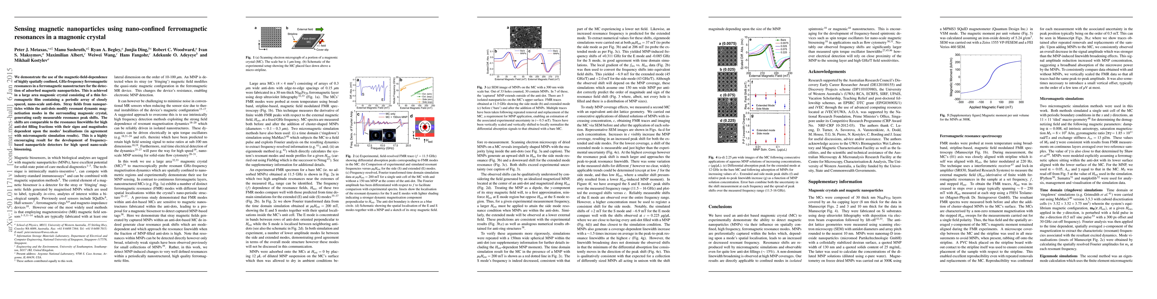 We demonstrate the use of the magnetic-field-dependence of highly spatially confined, GHz-frequency ferromagnetic resonances in a ferromagnetic nanostructure for the detection of adsorbed magnetic nanoparticles. This is achieved in a large area magnonic crystal consisting of a thin ferromagnetic film containing a periodic array of closely spaced, nano-scale anti-dots. Stray fields from nanoparticles within the anti-dots modify resonant dynamic magnetisation modes in the surrounding magnonic crystal, generating easily measurable resonance peak shifts. The shifts are comparable to the resonance linewidths for high anti-dot filling fractions with their signs and magnitudes dependent upon the modes' localisations (in agreement with micromagnetic simulation results). This is a highly encouraging result for the development of frequency-based nanoparticle detectors for high speed nano-scale biosensing.