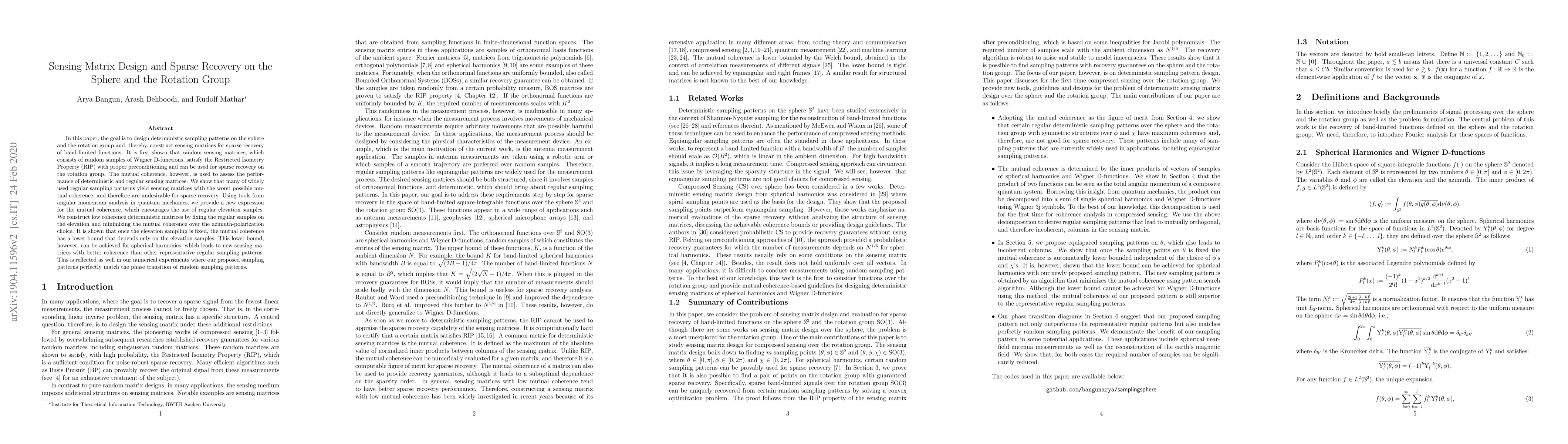 Researchers designed deterministic sampling patterns on the sphere and rotation group to improve sparse recovery of band-limited functions, achieving lower mutual coherence than traditional regular sampling patterns.