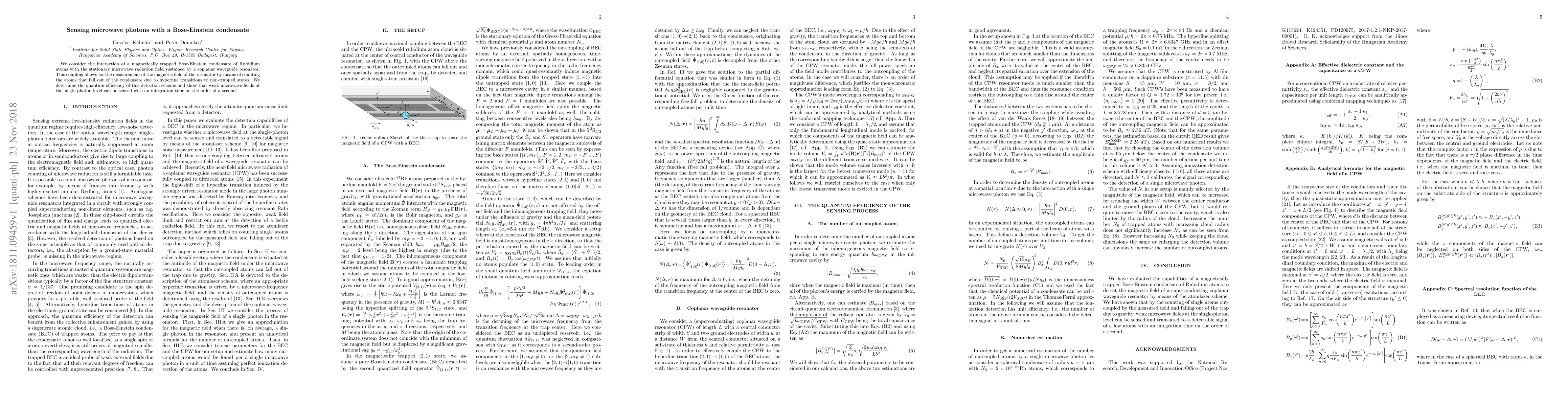 This paper investigates the interaction between a Bose-Einstein condensate of Rubidium atoms and a microwave radiation field, enabling the detection of magnetic fields through atom counting. The study demonstrates the quantum efficiency of this method, confirming the ability to sense single-photon microwave fields within a second.