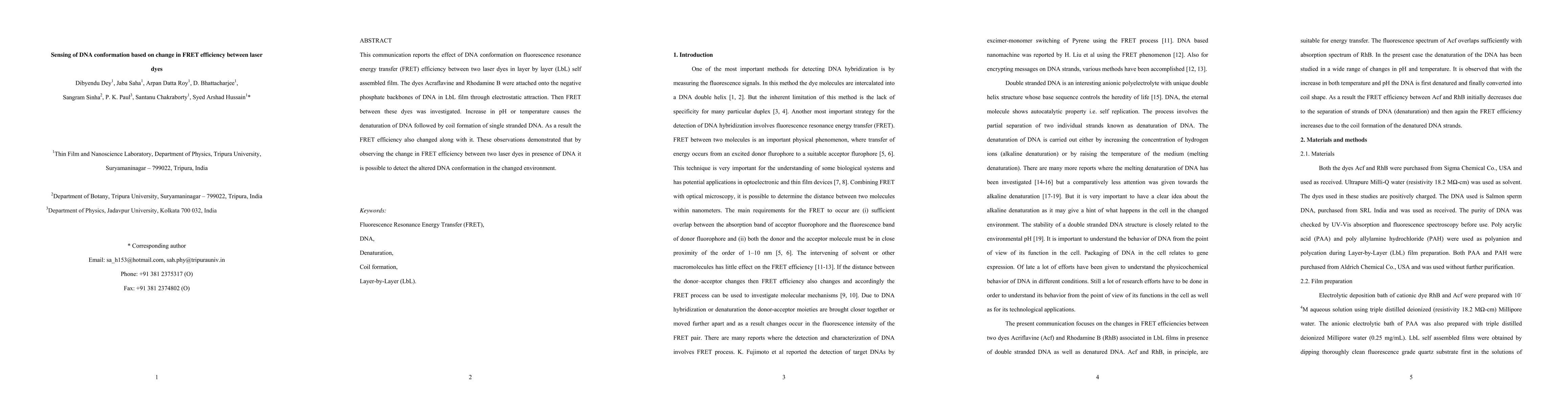 This communication reports the effect of DNA conformation on fluorescence resonance energy transfer (FRET) efficiency between two laser dyes in layer by layer (LbL) self assembled film. The dyes Acraflavine and Rhodamine B were attached onto the negative phosphate backbones of DNA in LbL film through electrostatic attraction. Then FRET between these dyes was investigated. Increase in pH or temperature causes the denaturation of DNA followed by coil formation of single stranded DNA. As a result the FRET efficiency also changed along with it. These observations demonstrated that by observing the change in FRET efficiency between two laser dyes in presence of DNA it is possible to detect the altered DNA conformation in the changed environment.