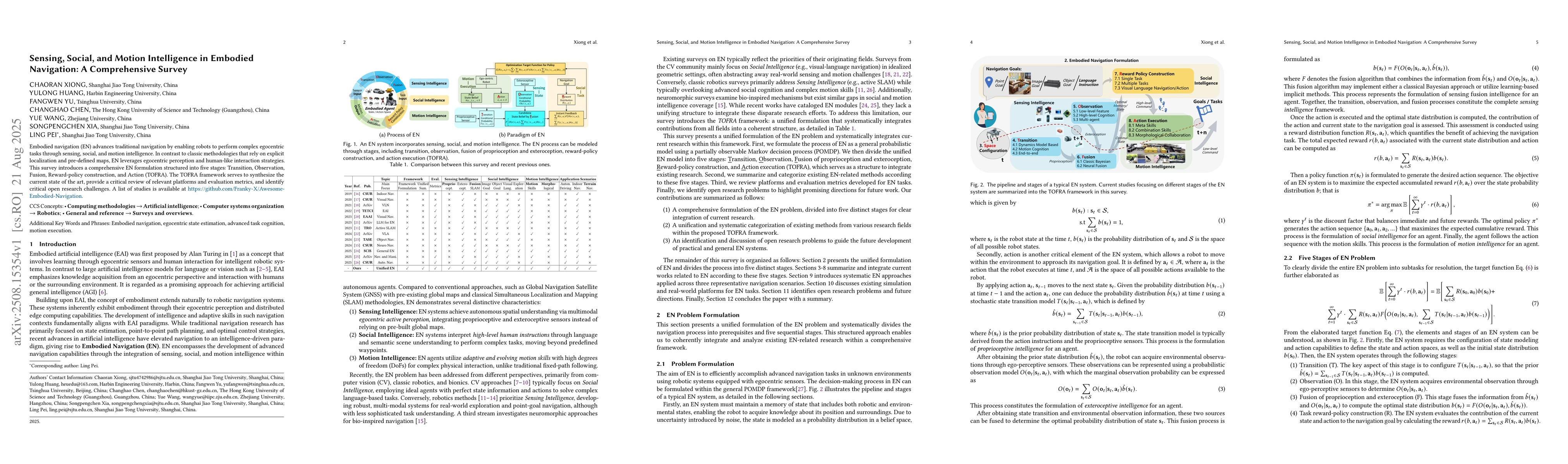 Embodied navigation (EN) advances traditional navigation by enabling robots to perform complex egocentric tasks through sensing, social, and motion intelligence. In contrast to classic methodologies that rely on explicit localization and pre-defined maps, EN leverages egocentric perception and human-like interaction strategies. This survey introduces a comprehensive EN formulation structured into five stages: Transition, Observation, Fusion, Reward-policy construction, and Action (TOFRA). The TOFRA framework serves to synthesize the current state of the art, provide a critical review of relevant platforms and evaluation metrics, and identify critical open research challenges. A list of studies is available at https://github.com/Franky-X/Awesome-Embodied-Navigation.