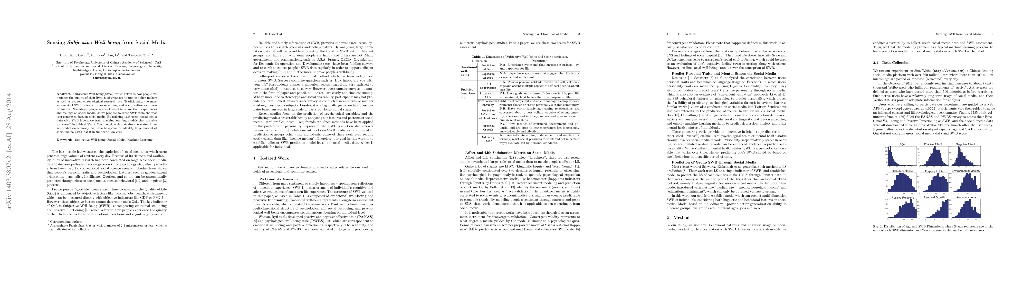 This paper proposes a method to measure Subjective Well-being (SWB) from social media data using machine learning models trained on labeled user data. The developed model achieves state-of-the-art prediction accuracy, enabling low-cost, large-scale SWB identification.