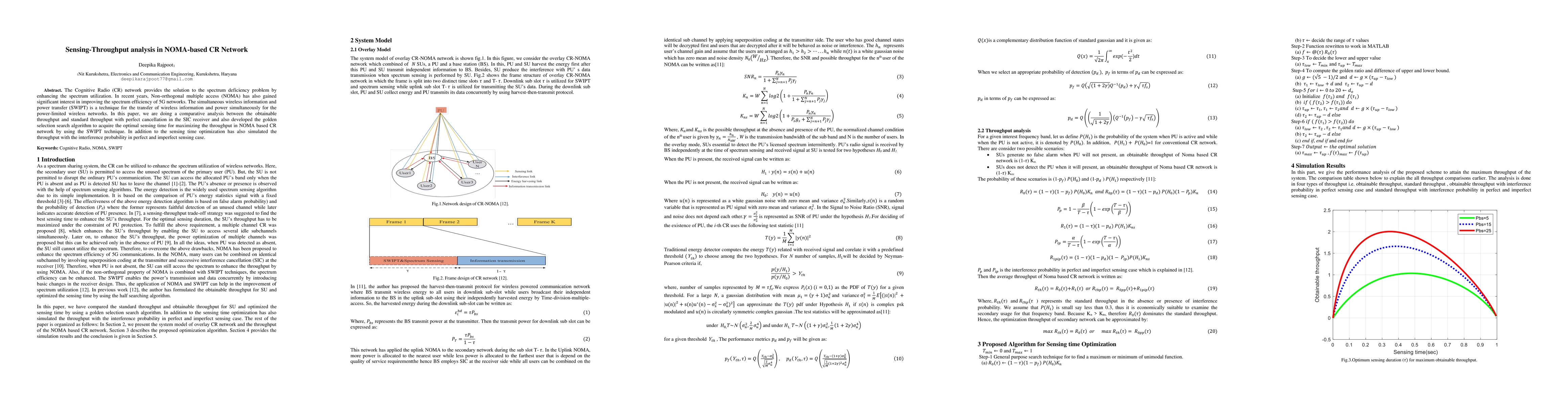 The Cognitive Radio (CR) network provides the solution to the spectrum deficiency problem by enhancing the spectrum utilization. In recent years, Non-orthogonal multiple access (NOMA) has also gained significant interest in improving the spectrum efficiency of 5G networks. The simultaneous wireless information and power transfer (SWIPT) is a technique for the transfer of wireless information and power simultaneously for the power-limited wireless networks. In this paper, we are doing a comparative analysis between the obtainable throughput and standard throughput with perfect cancellation in the SIC receiver and also developed the golden selection search algorithm to acquire the optimal sensing time for maximizing the throughput in NOMA based CR network by using the SWIPT technique. In addition to the sensing time optimization has also simulated the throughput with the interference probability in perfect and imperfect sensing case.