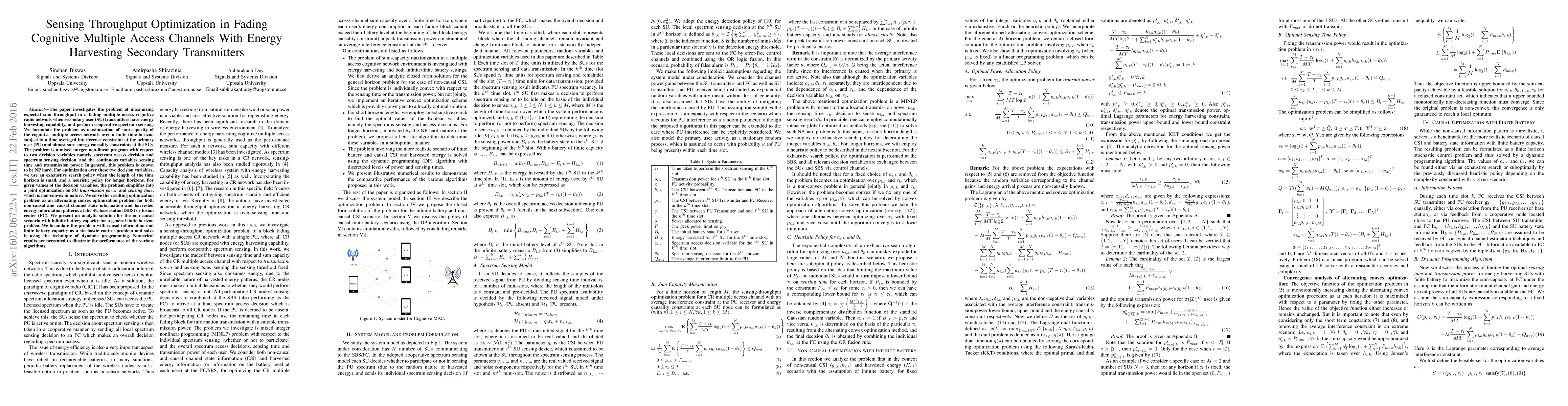 This paper optimizes expected sum throughput in a fading cognitive radio network where secondary users (SUs) have energy harvesting capabilities and perform cooperative spectrum sensing. It employs mixed integer non-linear programming to maximize sum-capacity under interference and energy constraints, using heuristic and exhaustive search methods for optimization. Analytical and dynamic programming approaches are applied for different channel information scenarios.