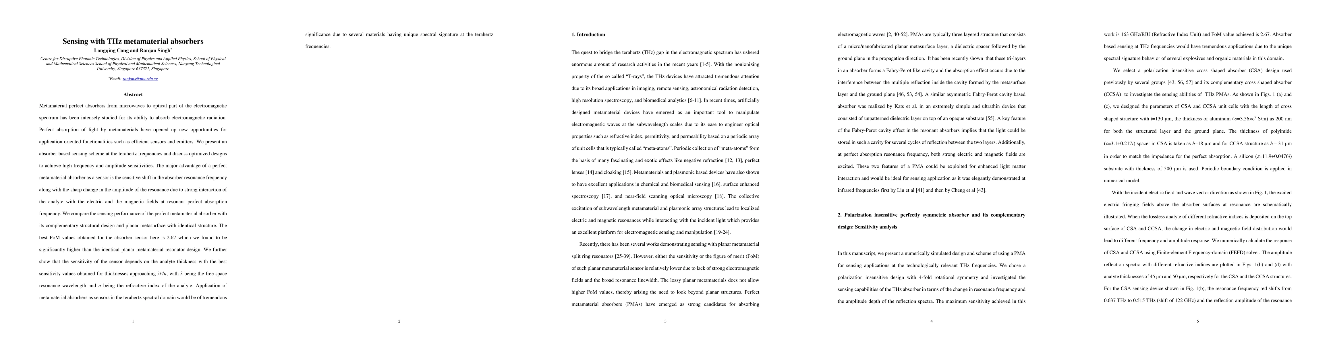This paper presents a terahertz metamaterial absorber-based sensing scheme, demonstrating high sensitivity and frequency shifts due to strong electromagnetic interactions. The optimized absorber design shows superior performance compared to planar metamaterial resonators, achieving a figure of merit of 2.67, and optimal sensitivity for analyte thicknesses near λ/4n.