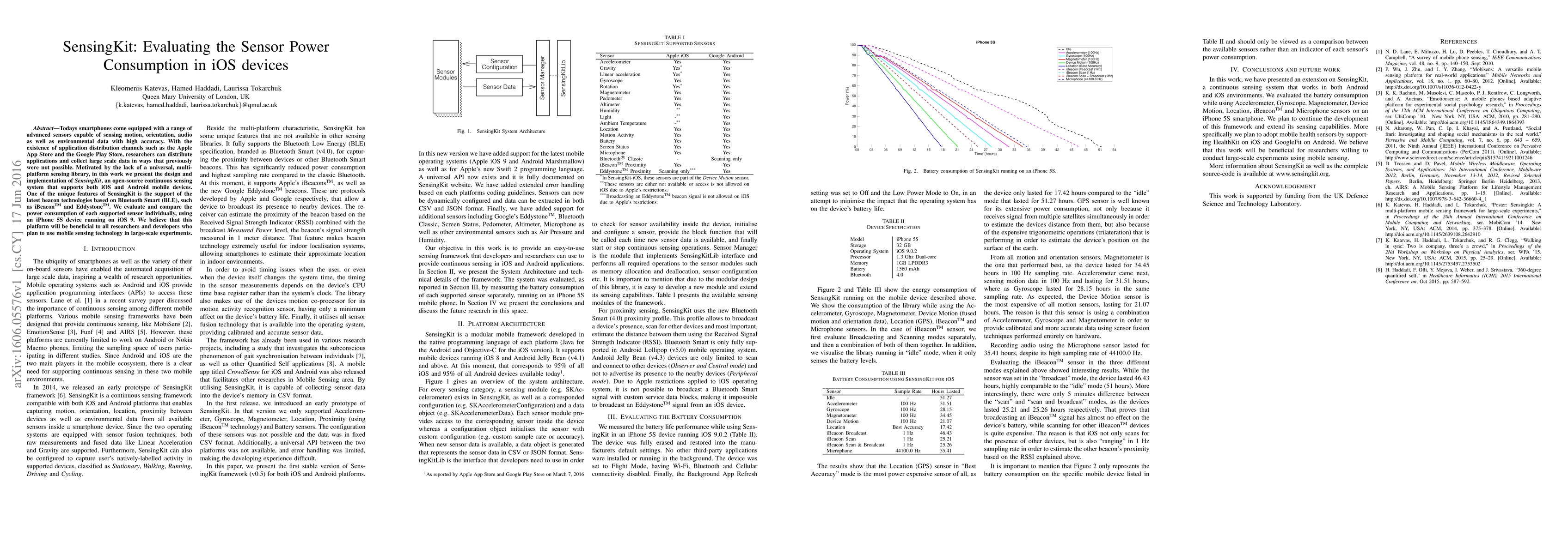 SensingKit is an open-source continuous sensing system designed to evaluate sensor power consumption on iOS and Android devices, with a focus on the latest Bluetooth Smart technologies. The study specifically compares sensor power usage on an iPhone 5S, aiming to assist researchers in large-scale mobile sensing experiments.