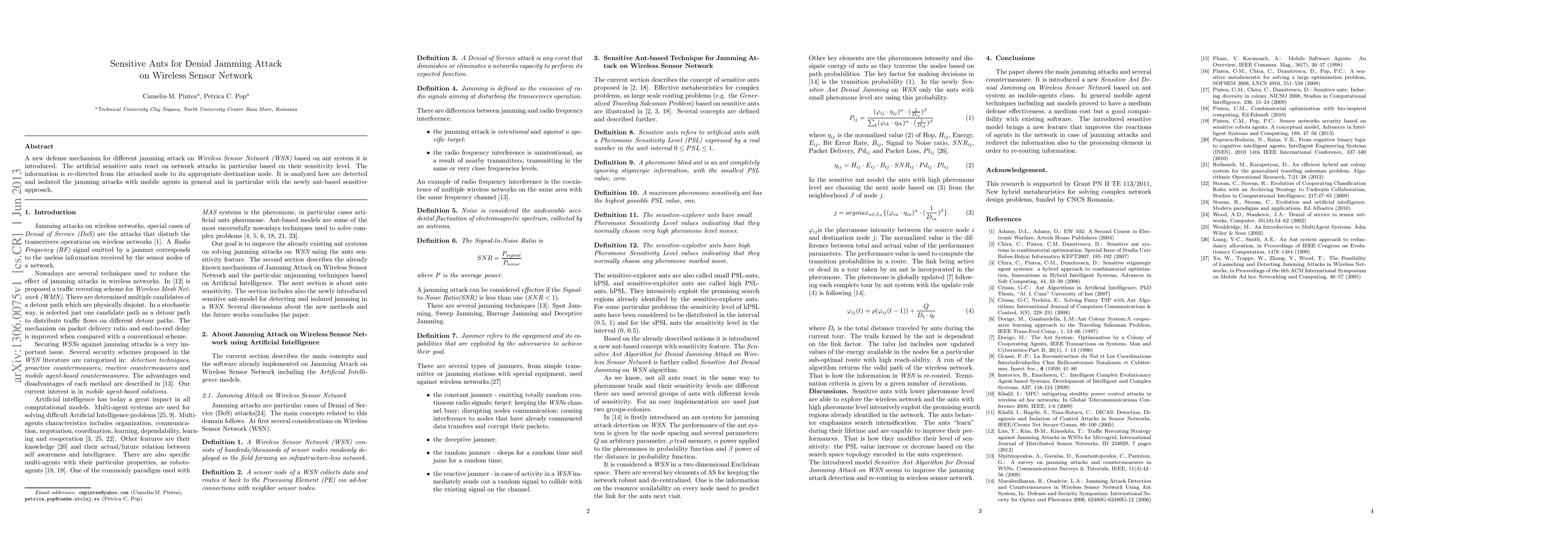 This paper introduces a novel defense mechanism against jamming attacks in Wireless Sensor Networks (WSN) using an ant-based system. The artificial sensitive ants detect and isolate jamming attacks, redirecting information from compromised nodes to appropriate destinations.