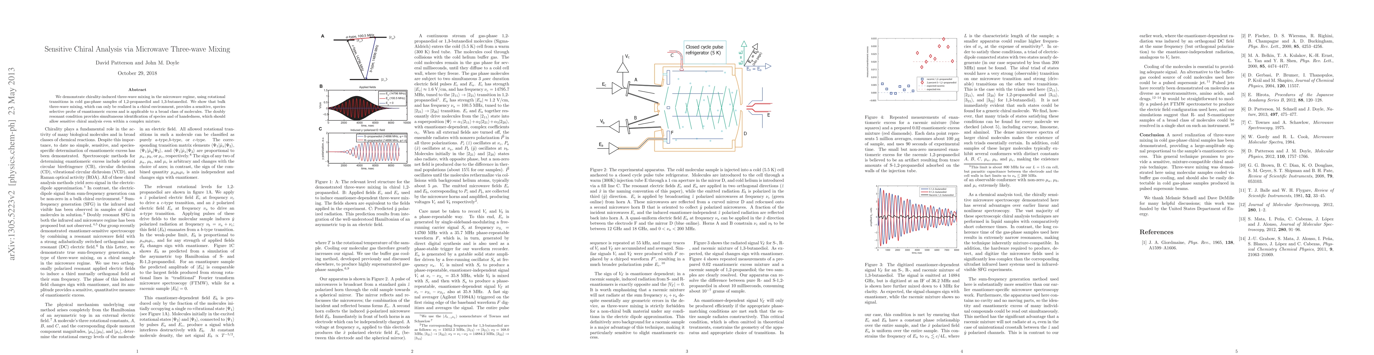 This paper presents a novel method for sensitive chiral analysis using microwave three-wave mixing in cold gas-phase samples of chiral molecules like 1,2-propanediol and 1,3-butanediol. The technique enables species-selective detection of enantiomeric excess and is applicable to a wide range of chiral compounds.