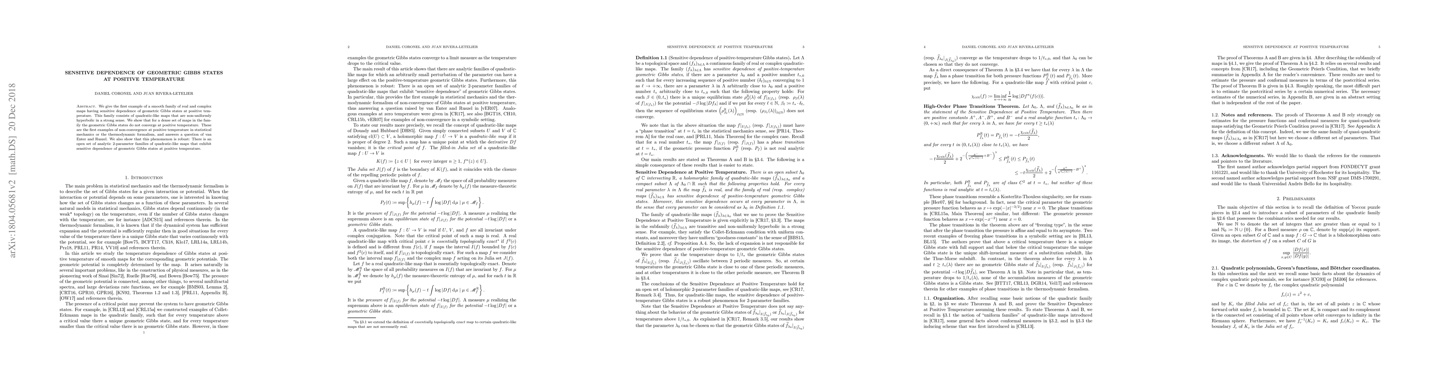 We give the first example of a smooth family of real and complex maps having sensitive dependence of geometric Gibbs states at positive temperature. This family consists of quadratic-like maps that are non-uniformly hyperbolic in a strong sense. We show that for a dense set of maps in the family the geometric Gibbs states do not converge at positive temperature. These are the first examples of non-convergence at positive temperature in statistical mechanics or the thermodynamic formalism, and answers a question of van Enter and Ruszel. We also show that this phenomenon is robust: There is an open set of analytic 2-parameter families of quadratic-like maps that exhibit sensitive dependence of geometric Gibbs states at positive temperature.