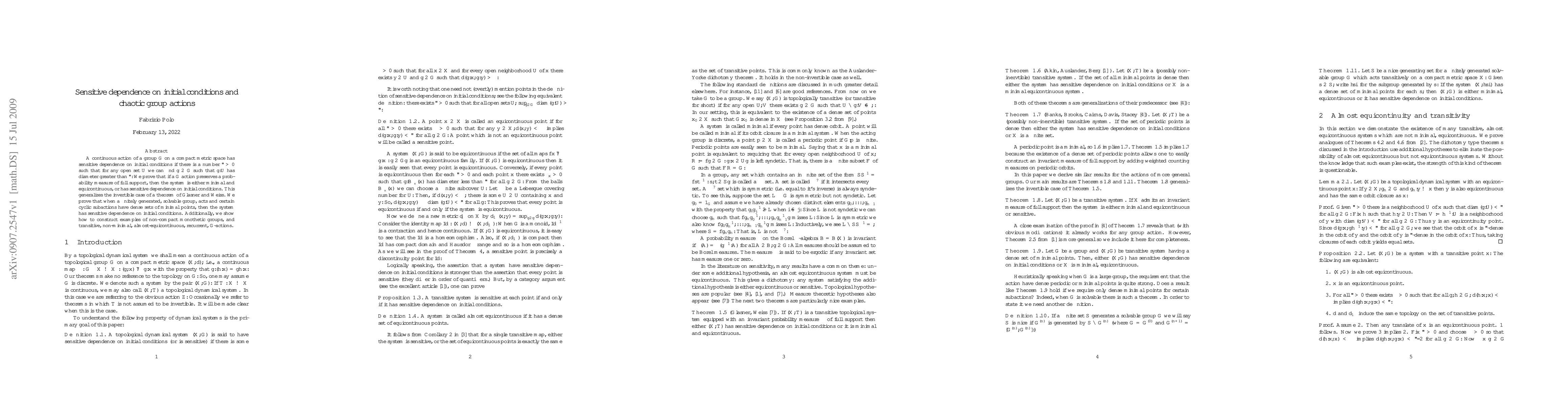 This paper explores the sensitive dependence on initial conditions in continuous group actions on compact metric spaces, proving that such actions either are minimal and equicontinuous or exhibit sensitive dependence. It generalizes previous results and constructs examples of non-compact, recurrent group actions with specific properties.