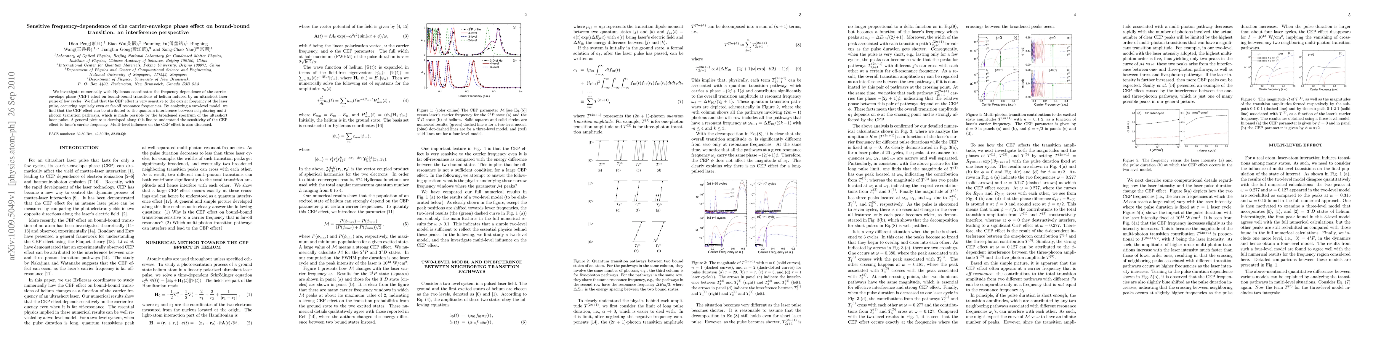 This paper numerically explores the carrier-envelope phase effect on bound-bound transitions in helium under ultrashort laser pulses, revealing that the effect is highly sensitive to the laser's carrier frequency. The CEP effect arises from quantum interference between neighboring multi-photon pathways, facilitated by the laser pulse's broadened spectrum.