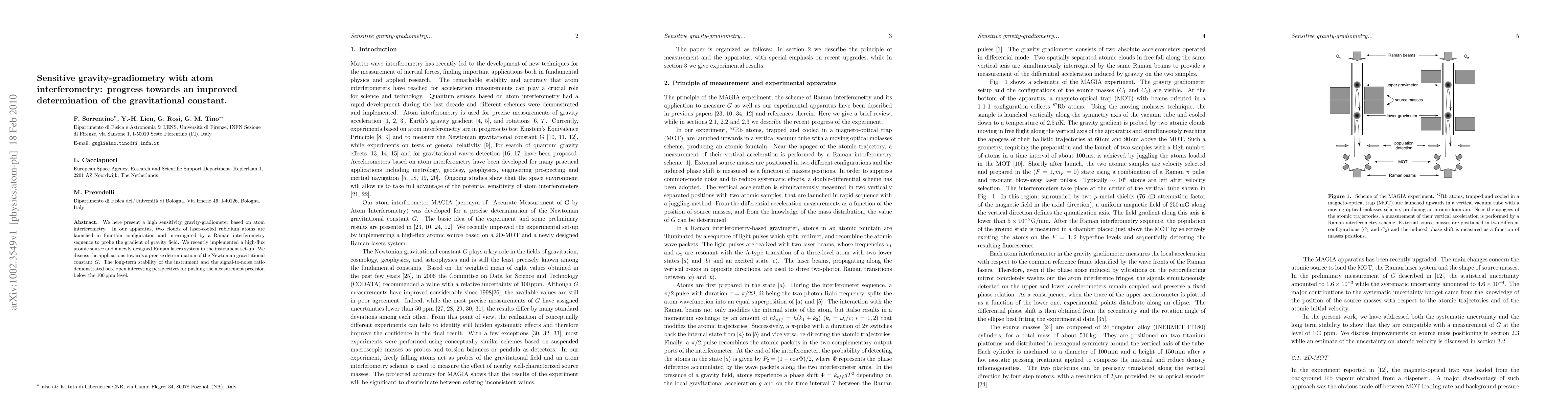 This paper details a high-sensitivity gravity-gradiometer using atom interferometry with laser-cooled rubidium atoms to measure gravitational field gradients. The implementation of a high-flux atomic source and advanced Raman lasers enhances precision, aiming for a Newtonian gravitational constant G determination with sub-100 ppm accuracy.