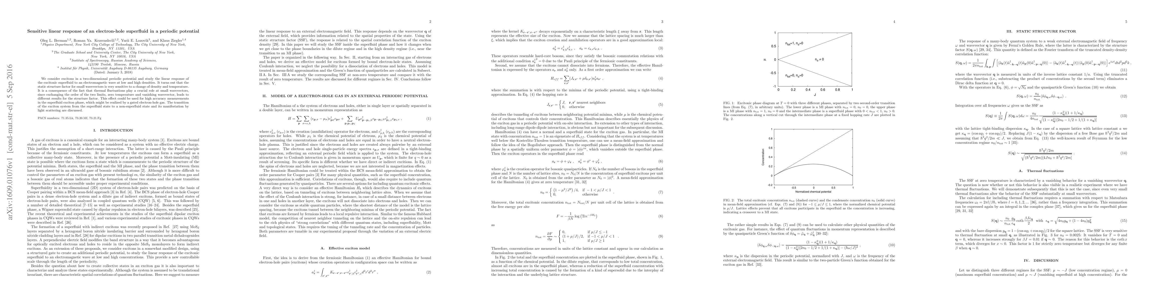 We consider excitons in a two-dimensional periodic potential and study the linear response of the excitonic superfluid to an electromagnetic wave at low and high densities. It turns out that the static structure factor for small wavevectors is very sensitive to a change of density and temperature. It is a consequence of the fact that thermal fluctuations play a crucial role at small wavevectors, since exchanging the order of the two limits, zero temperature and vanishing wavevector, leads to different results for the structure factor. This effect could be used for high accuracy measurements in the superfluid exciton phase, which might be realized by a gated electron-hole gas. The transition of the exciton system from the superfluid state to a non-superfluid state and its manifestation by light scattering are discussed.