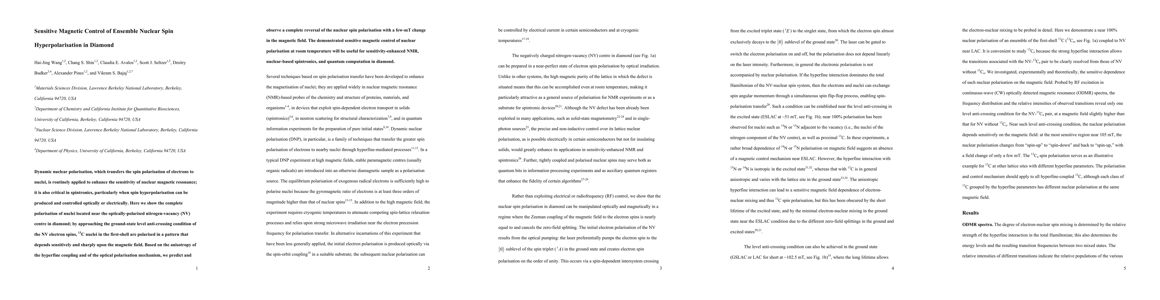 This paper demonstrates the sensitive magnetic control of nuclear spin hyperpolarisation in diamond near optically-polarised nitrogen-vacancy centres, achieving complete polarisation of 13C nuclei with a sharp dependence on magnetic field. This control is pivotal for enhancing NMR sensitivity and advancing nuclear-based spintronics and quantum computation.