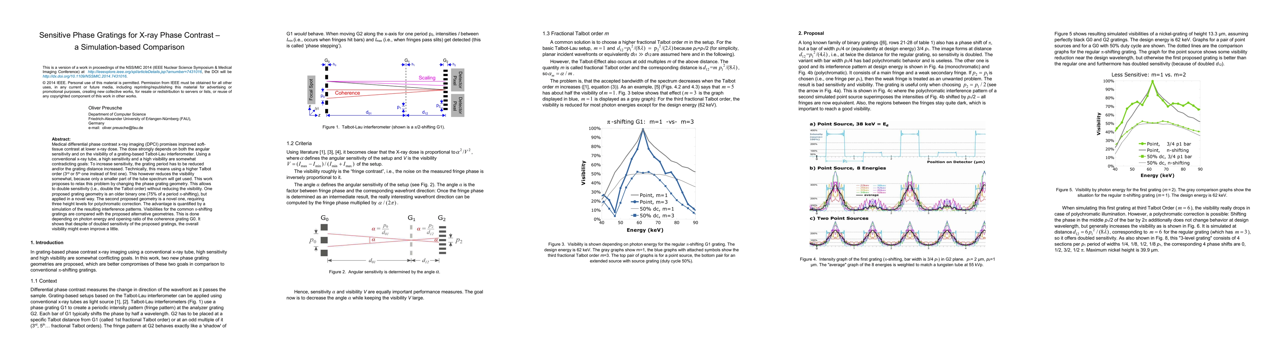 Medical differential phase contrast x-ray imaging (DPCI) promises improved soft-tissue contrast at lower x-ray dose. The dose strongly depends on both the angular sensitivity and on the visibility of a grating-based Talbot-Lau interferometer. Using a conventional x-ray tube, a high sensitivity and a high visibility are somewhat contradicting goals: To increase sensitivity, the grating period has to be reduced and/or the grating distance increased. Technically, this means using a higher Talbot order (3rd or 5th one instead of first one). This however reduces the visibility somewhat, because only a smaller part of the tube spectrum will get used. This work proposes to relax this problem by changing the phase grating geometry. This allows to double sensitivity (i.e., double the Talbot order) without reducing the visibility. One proposed grating geometry is an older binary one (75% of a period $\pi$-shifting), but applied in a novel way. The second proposed geometry is a novel one, requiring three height levels for polychromatic correction. The advantage is quantified by a simulation of the resulting interference patterns. Visibilities for the common $\pi$-shifting gratings are compared with the proposed alternative geometries. This is done depending on photon energy and opening ratio of the coherence grating G0. It shows that despite of doubled sensitivity of the proposed gratings, the overall visibility might even improve a little.