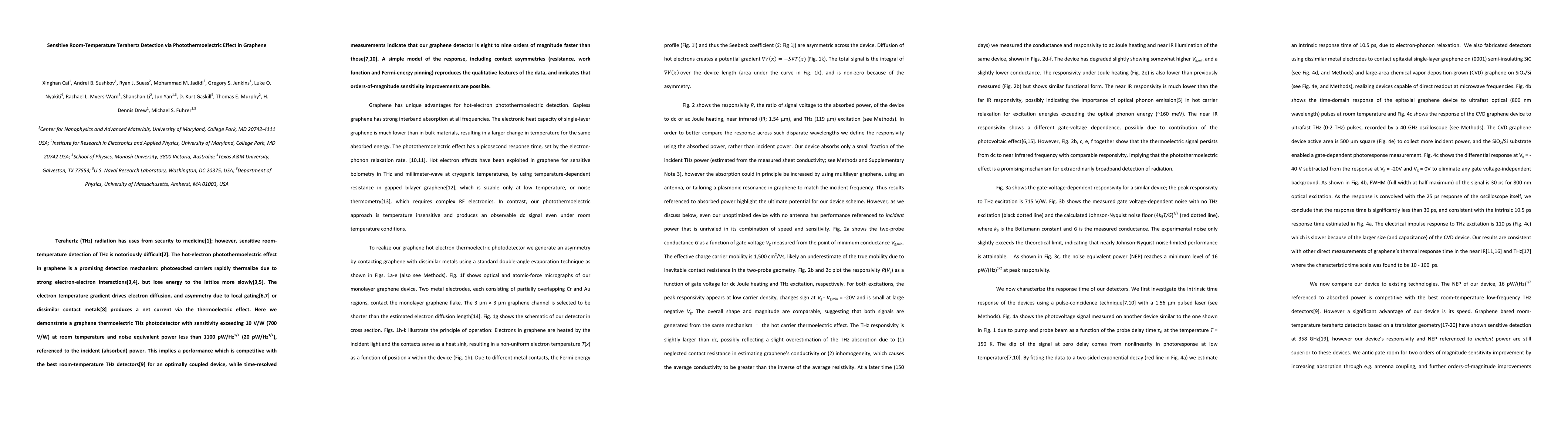 This paper presents a highly sensitive room-temperature terahertz detector based on the photothermoelectric effect in graphene, achieving sensitivity of 700 V/W and noise equivalent power below 20 pW/Hz^1/2. The detector's rapid response, up to nine orders of magnitude faster than conventional detectors, is attributed to the unique thermal dynamics of graphene's hot-electrons.