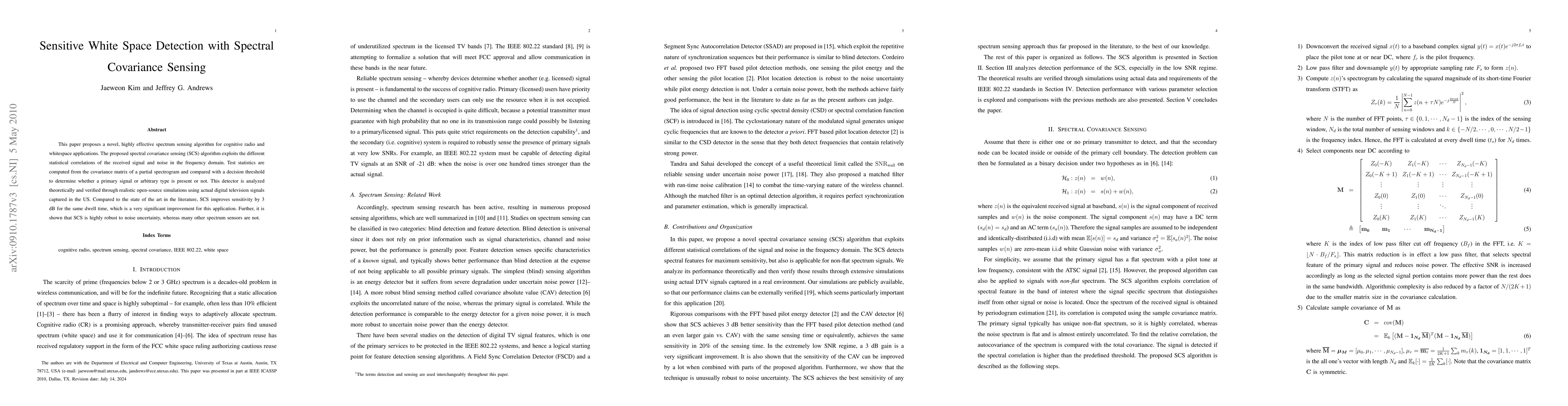 This paper proposes a novel, highly effective spectrum sensing algorithm for cognitive radio and whitespace applications. The proposed spectral covariance sensing (SCS) algorithm exploits the different statistical correlations of the received signal and noise in the frequency domain. Test statistics are computed from the covariance matrix of a partial spectrogram and compared with a decision threshold to determine whether a primary signal or arbitrary type is present or not. This detector is analyzed theoretically and verified through realistic open-source simulations using actual digital television signals captured in the US. Compared to the state of the art in the literature, SCS improves sensitivity by 3 dB for the same dwell time, which is a very significant improvement for this application. Further, it is shown that SCS is highly robust to noise uncertainty, whereas many other spectrum sensors are not.
