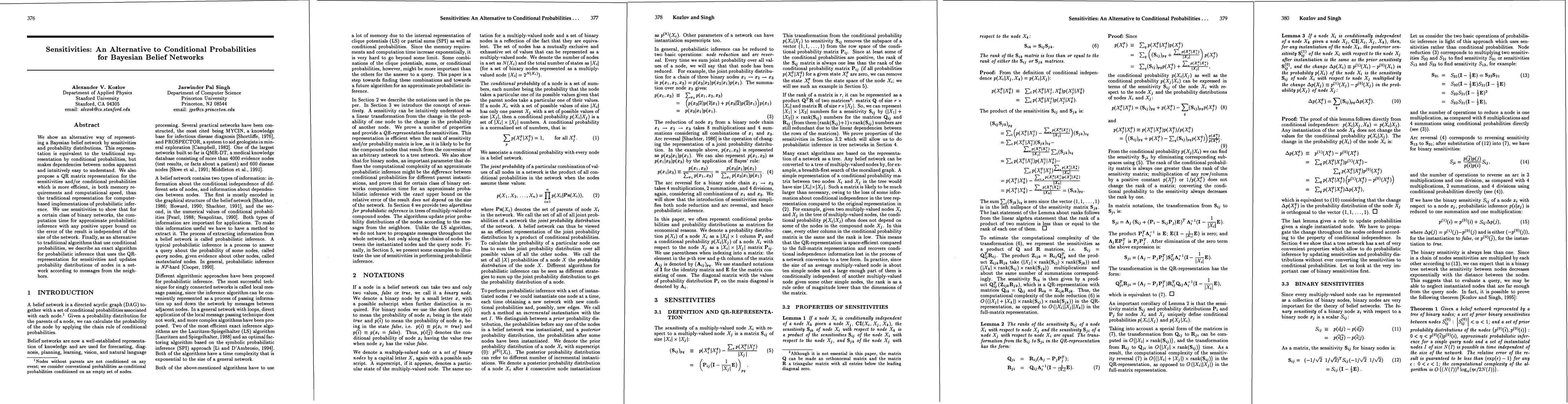 This paper proposes an alternative to conditional probabilities for Bayesian belief networks using sensitivities and probability distributions, which makes dependencies clearer and proposes a more efficient QR matrix representation. It also introduces an exact algorithm for probabilistic inference that leverages this new representation, demonstrating computational efficiency and independence of computation time from network size for certain binary networks.