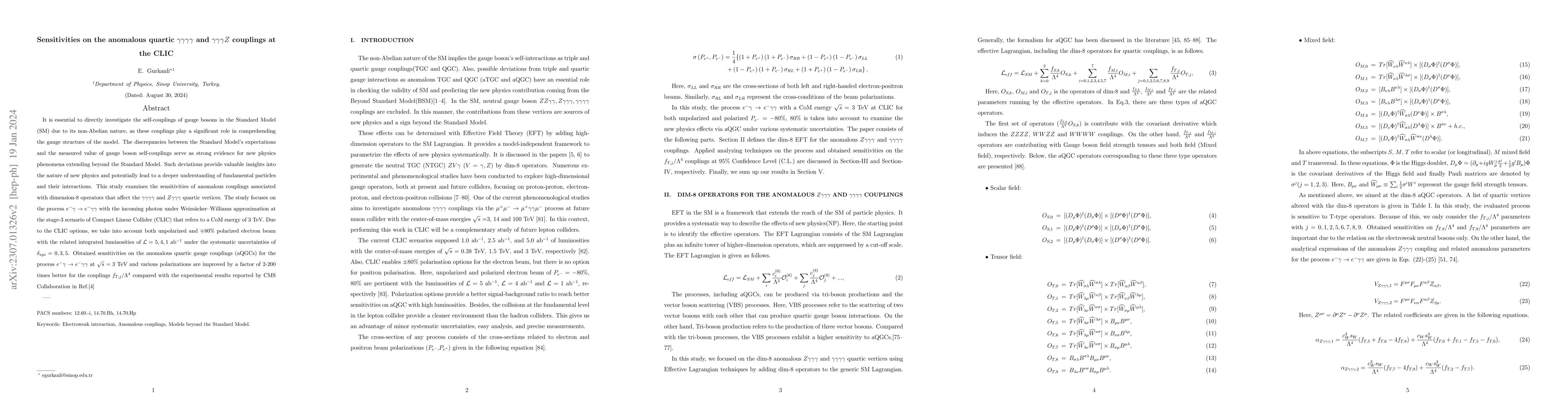 This paper explores the sensitivities of anomalous quartic gauge couplings in the $\gamma\gamma\gamma\gamma$ and $\gamma\gamma\gamma Z$ vertices at the CLIC collider, aiming to detect deviations from Standard Model predictions that could hint at new physics. The study finds that CLIC's capabilities, especially with higher polarized electron beams, can improve sensitivities by a factor of 2-200 compared to current experimental results.