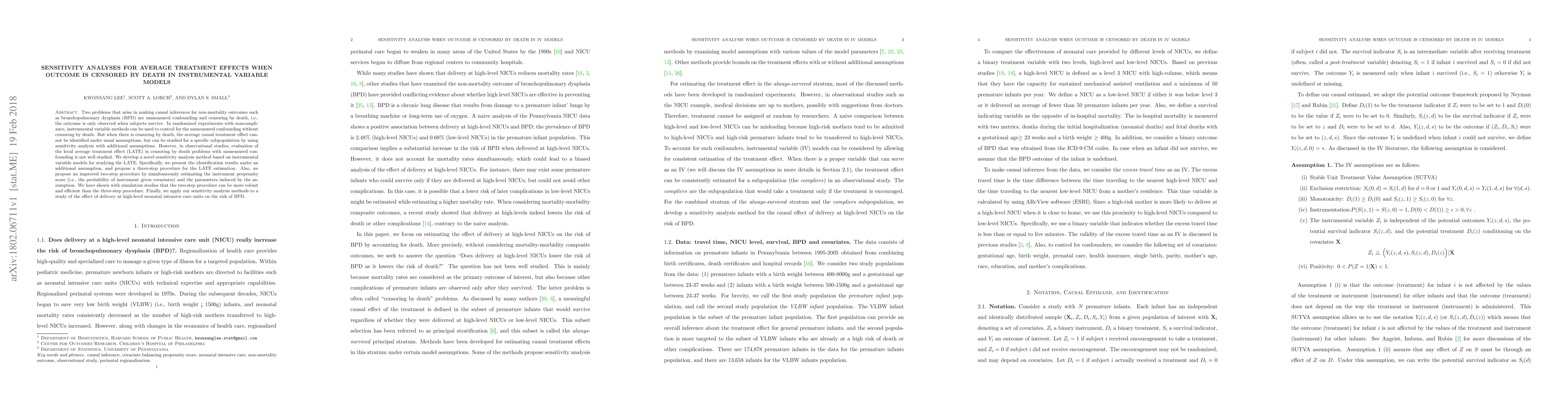 This paper develops a novel sensitivity analysis method for estimating the local average treatment effect (LATE) in observational studies where outcomes are censored by death and confounded by unmeasured factors. The authors propose a three-step and an improved two-step procedure for LATE estimation using instrumental variable models, demonstrating through simulations that the two-step method is more robust and efficient. The methods are applied to assess the effect of delivery at high-level neonatal intensive care units on bronchopulmonary dysplasia risk.