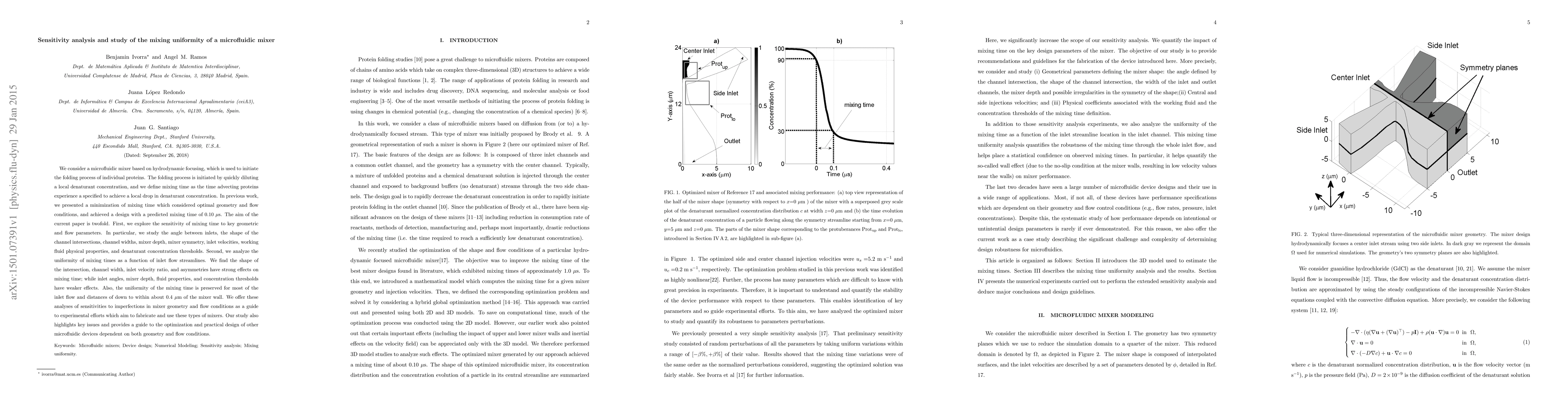 We consider a microfluidic mixer based on hydrodynamic focusing, which is used to initiate the folding process of individual proteins. The folding process is initiated by quickly diluting a local denaturant concentration, and we define mixing time as the time advecting proteins experience a specified to achieve a local drop in denaturant concentration. In previous work, we presented a minimization of mixing time which considered optimal geometry and flow conditions, and achieved a design with a predicted mixing time of 0.10 $\mu$s. The aim of the current paper is twofold. First, we explore the sensitivity of mixing time to key geometric and flow parameters. In particular, we study the angle between inlets, the shape of the channel intersections, channel widths, mixer depth, mixer symmetry, inlet velocities, working fluid physical properties, and denaturant concentration thresholds. Second, we analyze the uniformity of mixing times as a function of inlet flow streamlines. We find the shape of the intersection, channel width, inlet velocity ratio, and asymmetries have strong effects on mixing time; while inlet angles, mixer depth, fluid properties, and concentration thresholds have weaker effects. Also, the uniformity of the mixing time is preserved for most of the inlet flow and distances of down to within about 0.4 $\mu$m of the mixer wall. We offer these analyses of sensitivities to imperfections in mixer geometry and flow conditions as a guide to experimental efforts which aim to fabricate and use these types of mixers. Our study also highlights key issues and provides a guide to the optimization and practical design of other microfluidic devices dependent on both geometry and flow conditions.