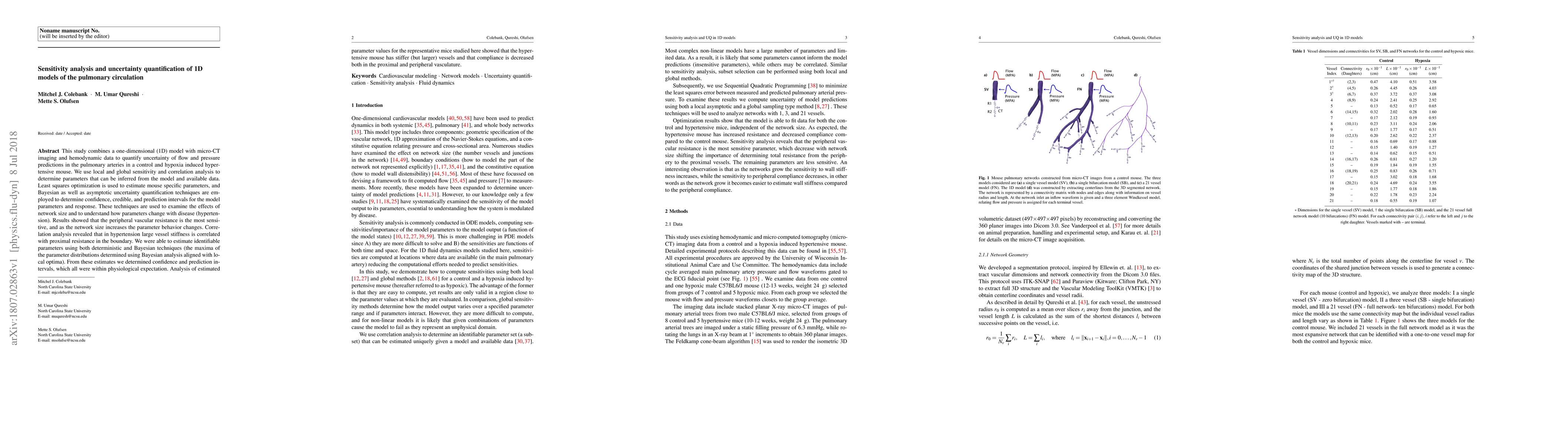 This study uses a 1D model of pulmonary circulation to quantify uncertainty in flow and pressure predictions under normal conditions and with hypertension. Key findings include the sensitivity of peripheral vascular resistance to changes in network size and correlations between vessel stiffness and proximal resistance.