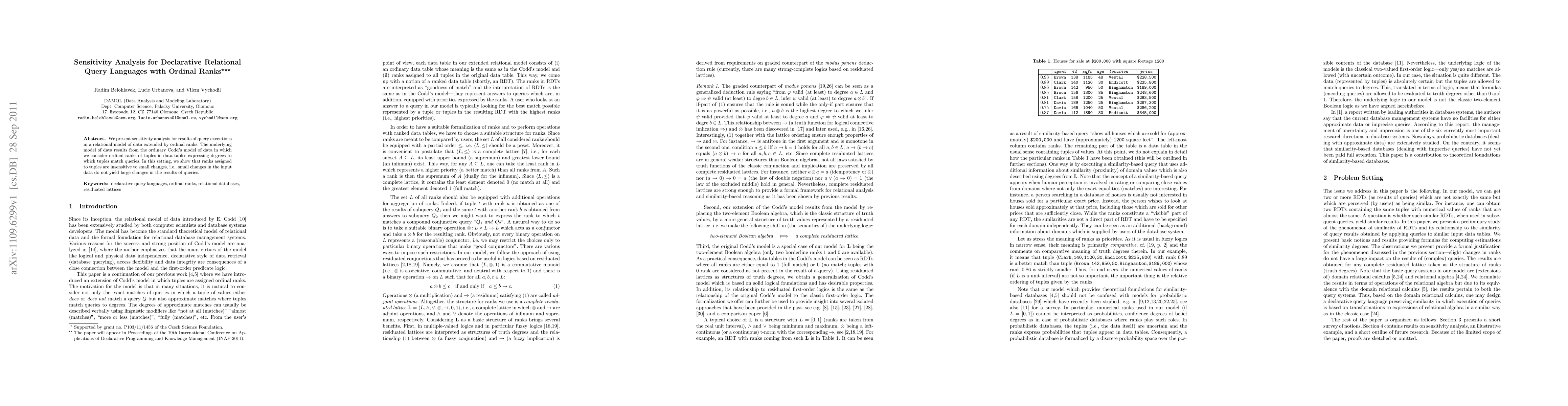 This paper conducts sensitivity analysis for query results in an extended relational model incorporating ordinal ranks, demonstrating that small changes in input data do not significantly alter query outcomes. The study highlights the robustness of rank assignments to minor variations.
