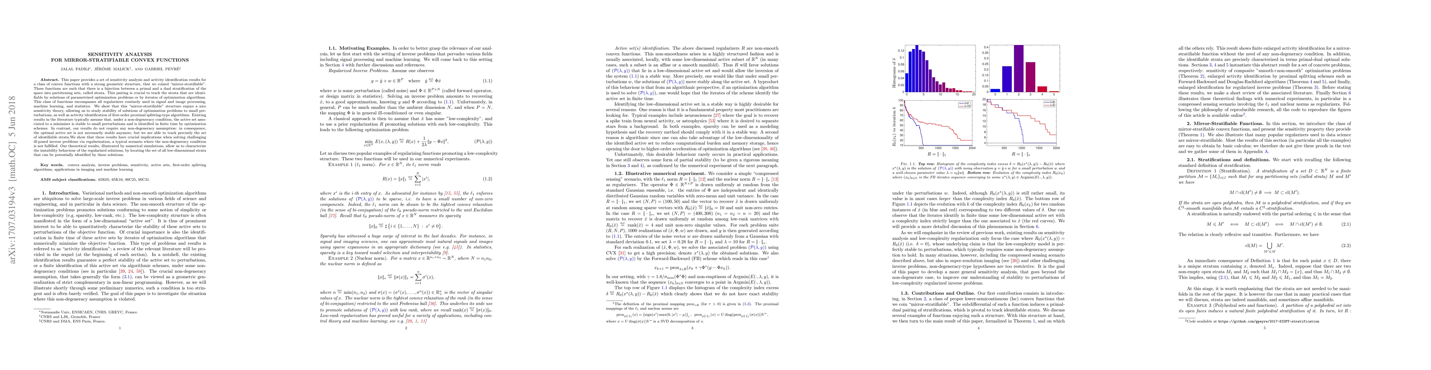 This paper develops sensitivity analysis and activity identification for "mirror-stratifiable" convex functions, which have a unique primal-dual stratification pairing. It reveals stability of optimization solutions under perturbations and identifies active sets without requiring non-degeneracy, with implications for solving ill-posed inverse problems via regularization.