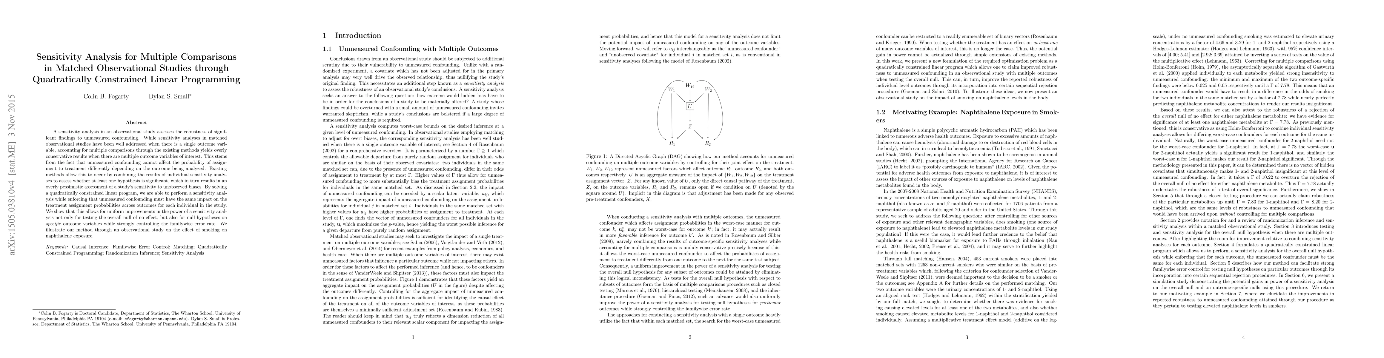 This paper proposes a quadratically constrained linear programming approach for sensitivity analysis in matched observational studies to better assess the robustness of findings to unmeasured confounding across multiple outcome variables. The method ensures consistent confounding effects across outcomes, thereby improving sensitivity analysis power and controlling the familywise error rate.