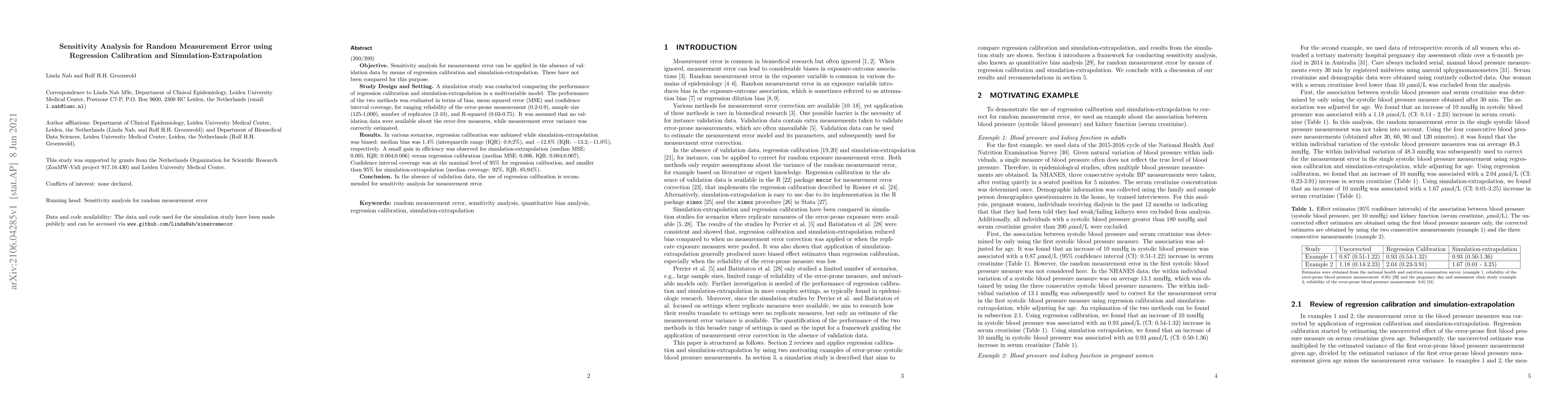 This study compares regression calibration and simulation-extrapolation for sensitivity analysis of random measurement error in the absence of validation data. Regression calibration was found to be unbiased and maintain nominal confidence interval coverage, while simulation-extrapolation showed bias and lower coverage, though it had slightly better efficiency.