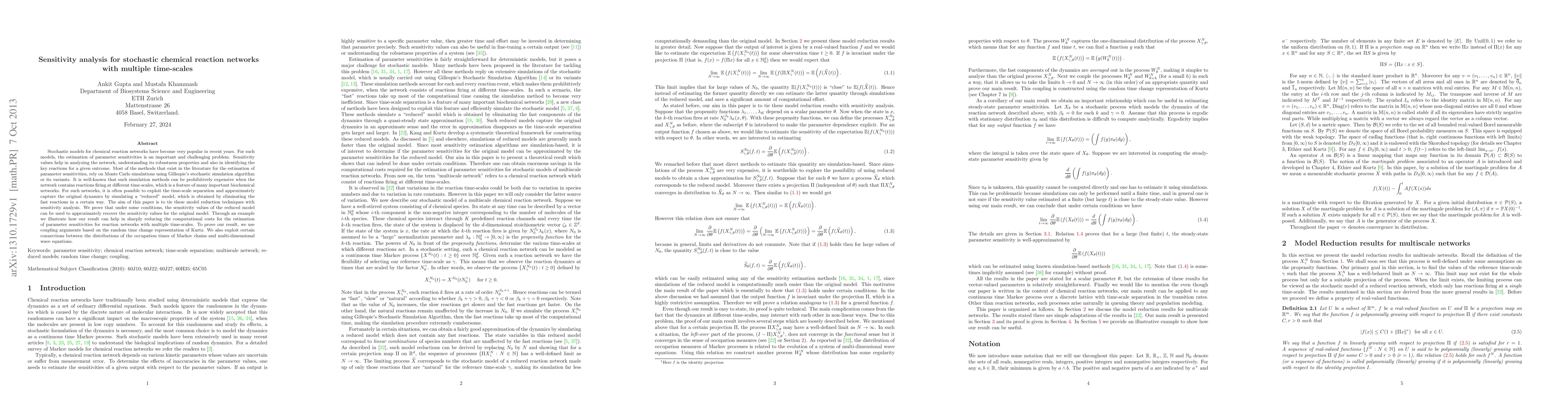 This paper investigates the sensitivity analysis for stochastic chemical reaction networks with multiple time-scales, proposing a method to reduce computational costs by linking reduced models to original network sensitivities. The authors demonstrate that under certain conditions, reduced model sensitivities can approximate original model sensitivities, significantly lowering the expense of sensitivity estimation.