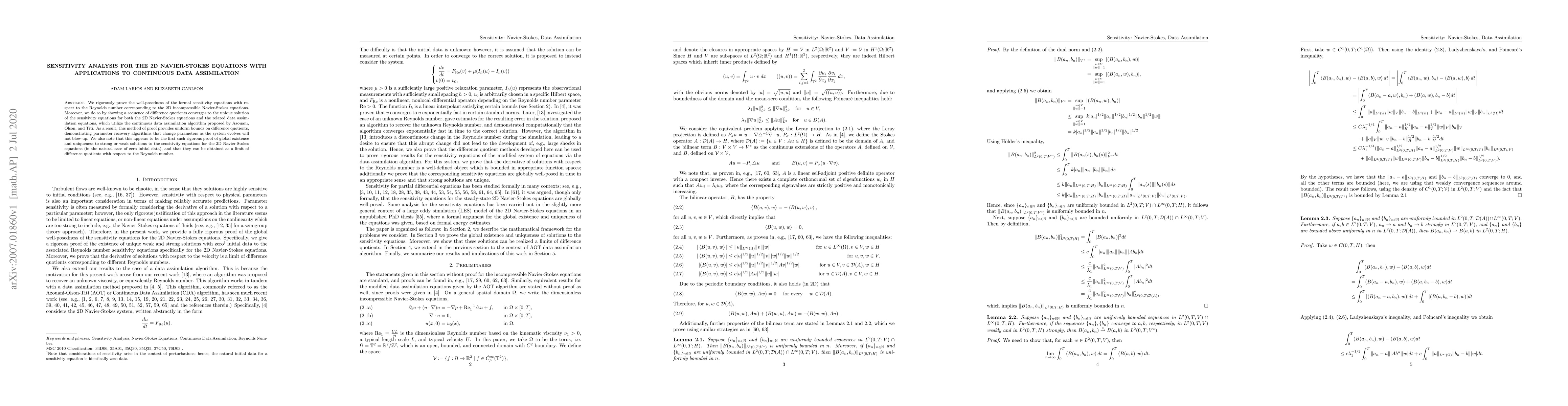This paper rigorously proves the well-posedness of sensitivity equations for the 2D Navier-Stokes equations, demonstrating uniform bounds for parameter recovery algorithms. It also establishes global existence and uniqueness of solutions to the sensitivity equations, showing they can be obtained as limits of difference quotients.
