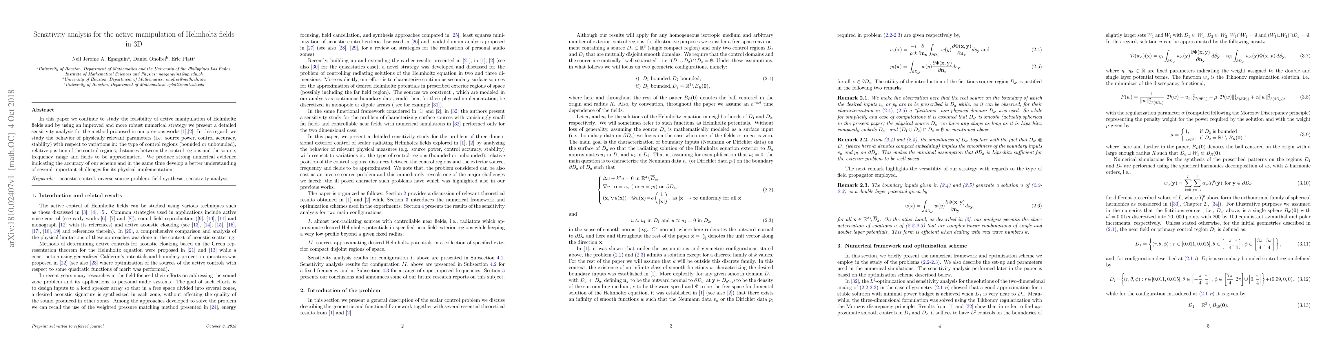 In this paper we continue to study the feasibility of active manipulation of Helmholtz fields and by using an improved and more robust numerical strategy we present a detailed sensitivity analysis for the method proposed in our previous works. In this regard, we study the behavior of physically relevant parameters (i.e. source power, control accuracy, stability) with respect to variations in: the type of control regions (bounded or unbounded), relative position of the control regions, distances between the control regions and the source, frequency range and fields to be approximated. We produce strong numerical evidence indicating the accuracy of our scheme and in the same time develop a better understanding of several important challenges for its physical implementation.