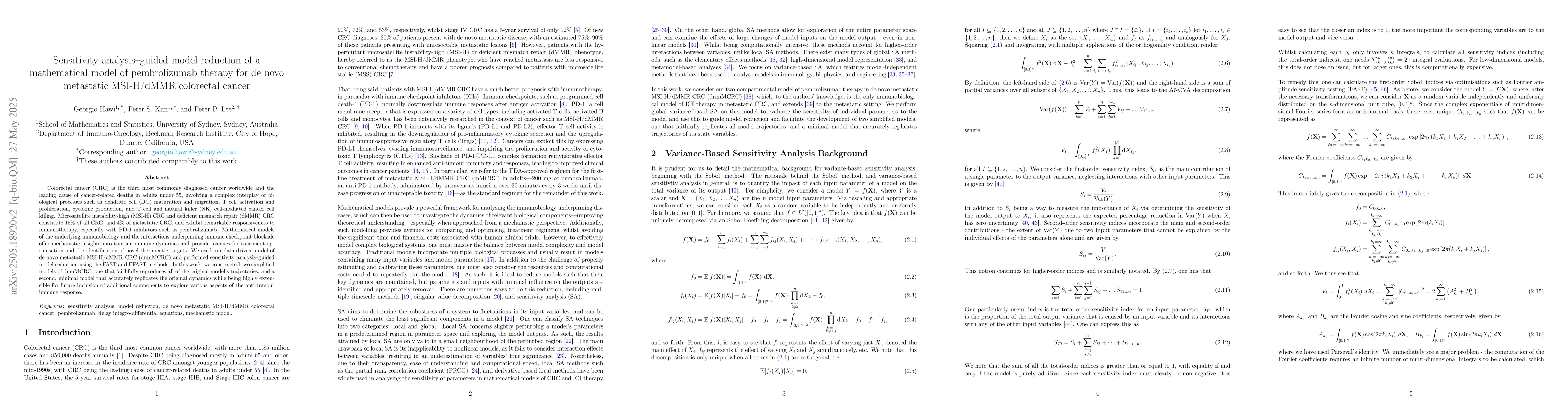 A mathematical model of pembrolizumab therapy for de novo metastatic MSI-H/dMMR colorectal cancer was simplified through sensitivity analysis-guided model reduction, providing a more extensible framework for exploring the anti-tumor immune response.