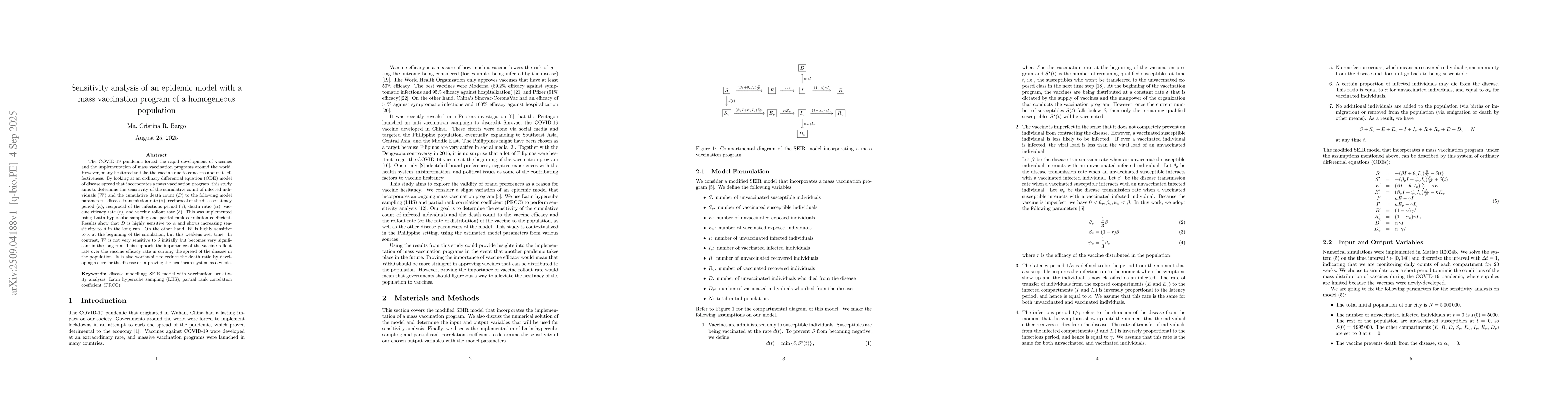 The COVID-19 pandemic forced the rapid development of vaccines and the implementation of mass vaccination programs around the world. However, many hesitated to take the vaccine due to concerns about its effectiveness. By looking at an ordinary differential equation (ODE) model of disease spread that incorporates a mass vaccination program, this study aims to determine the sensitivity of the cumulative count of infected individuals ($W$) and the cumulative death count ($D$) to the following model parameters: disease transmission rate ($\beta$), reciprocal of the disease latency period ($\kappa$), reciprocal of the infectious period ($\gamma$), death ratio ($\alpha$), vaccine efficacy rate ($r$), and vaccine rollout rate ($\delta$). This was implemented using Latin hypercube sampling and partial rank correlation coefficient. Results show that $D$ is highly sensitive to $\alpha$ and shows increasing sensitivity to $\delta$ in the long run. On the other hand, $W$ is highly sensitive to $\kappa$ at the beginning of the simulation, but this weakens over time. In contrast, $W$ is not very sensitive to $\delta$ initially but becomes very significant in the long run. This supports the importance of the vaccine rollout rate over the vaccine efficacy rate in curbing the spread of the disease in the population. It is also worthwhile to reduce the death ratio by developing a cure for the disease or improving the healthcare system as a whole.