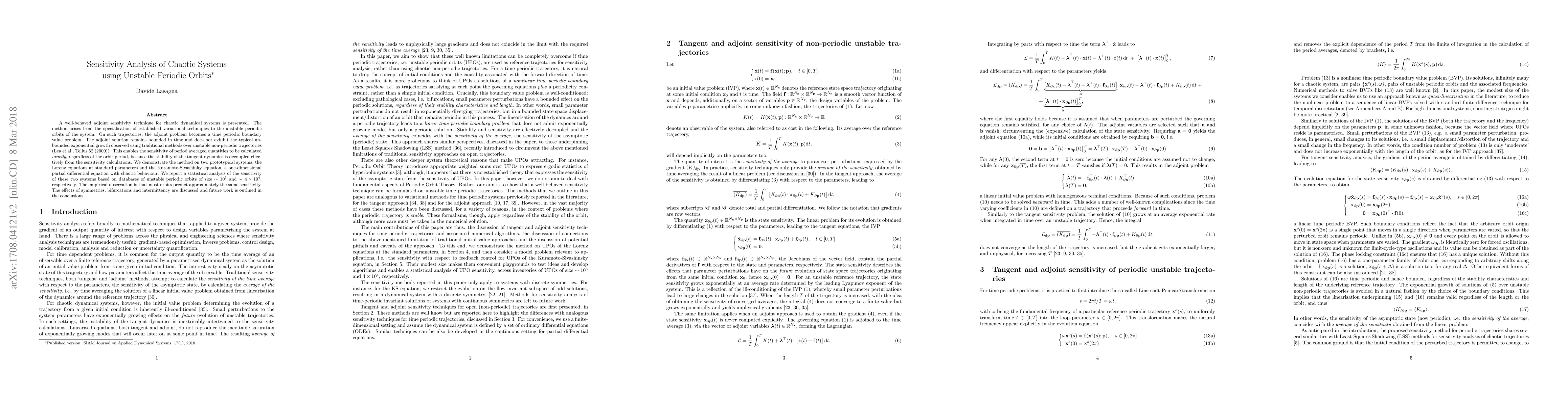 This paper introduces a novel adjoint sensitivity technique for chaotic systems, utilizing unstable periodic orbits to avoid the exponential growth issues of traditional methods. The method allows for precise calculation of the sensitivity of period-averaged quantities, demonstrated on the Lorenz and Kuramoto-Sivashinky equations, showing consistent sensitivity across large databases of unstable periodic orbits.