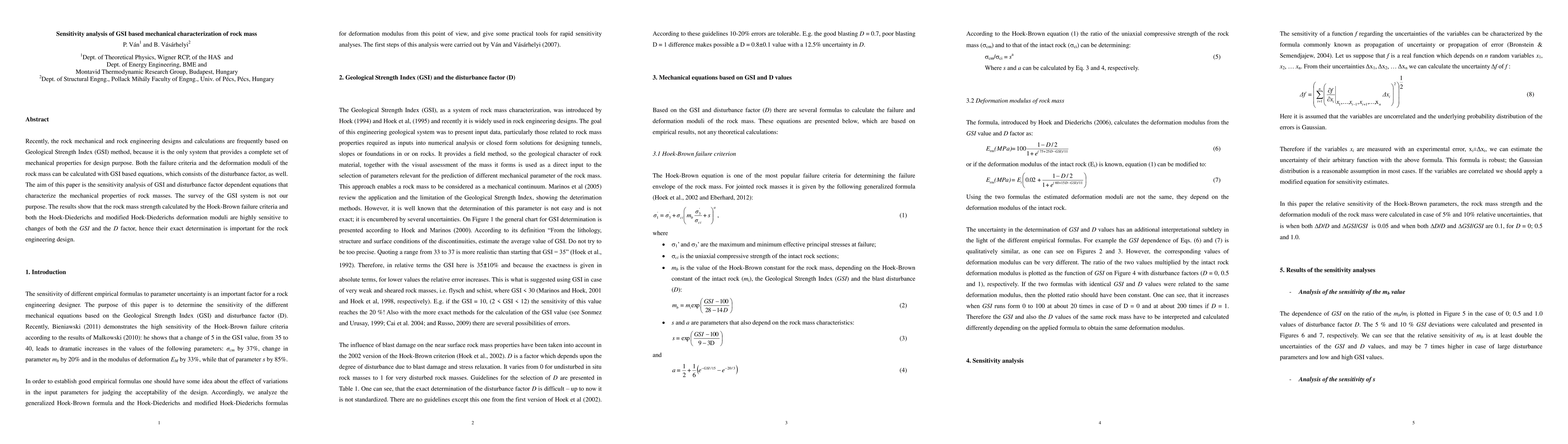 Recently, the rock mechanical and rock engineering designs and calculations are frequently based on Geological Strength Index (GSI) method, because it is the only system that provides a complete set of mechanical properties for design purpose. Both the failure criteria and the deformation moduli of the rock mass can be calculated with GSI based equations, which consists of the disturbance factor, as well. The aim of this paper is the sensitivity analysis of GSI and disturbance factor dependent equations that characterize the mechanical properties of rock masses. The survey of the GSI system is not our purpose. The results show that the rock mass strength calculated by the Hoek-Brown failure criteria and both the Hoek-Diederichs and modified Hoek-Diederichs deformation moduli are highly sensitive to changes of both the GSI and the D factor, hence their exact determination is important for the rock engineering design.