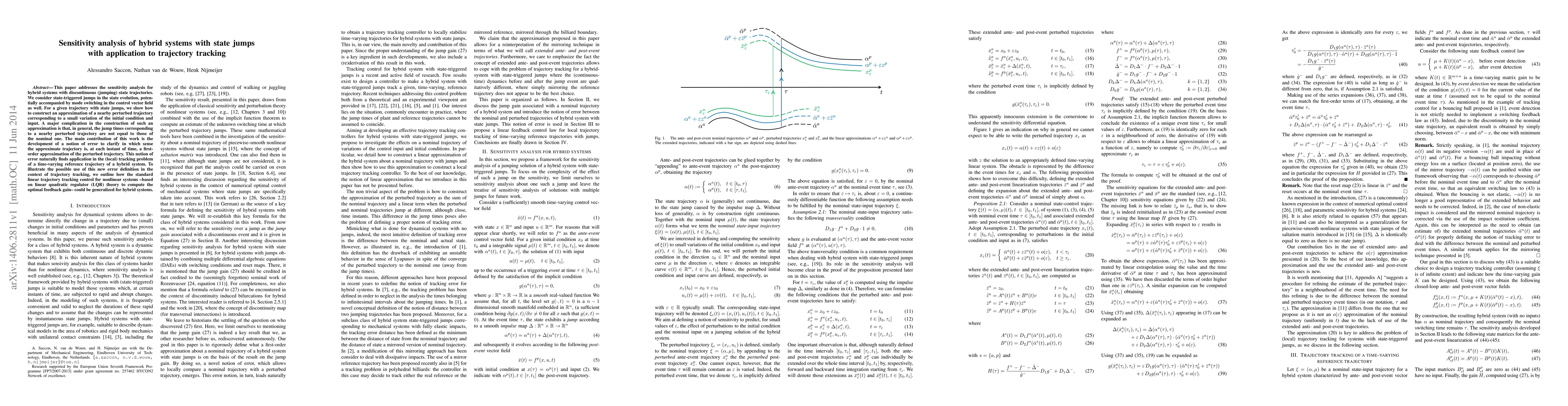 This paper addresses the sensitivity analysis for hybrid systems with discontinuous (jumping) state trajectories. We consider state-triggered jumps in the state evolution, potentially accompanied by mode switching in the control vector field as well. For a given trajectory with state jumps, we show how to construct an approximation of a nearby perturbed trajectory corresponding to a small variation of the initial condition and input. A major complication in the construction of such an approximation is that, in general, the jump times corresponding to a nearby perturbed trajectory are not equal to those of the nominal one. The main contribution of this work is the development of a notion of error to clarify in which sense the approximate trajectory is, at each instant of time, a firstorder approximation of the perturbed trajectory. This notion of error naturally finds application in the (local) tracking problem of a time-varying reference trajectory of a hybrid system. To illustrate the possible use of this new error definition in the context of trajectory tracking, we outline how the standard linear trajectory tracking control for nonlinear systems -based on linear quadratic regulator (LQR) theory to compute the optimal feedback gain- could be generalized for hybrid systems.