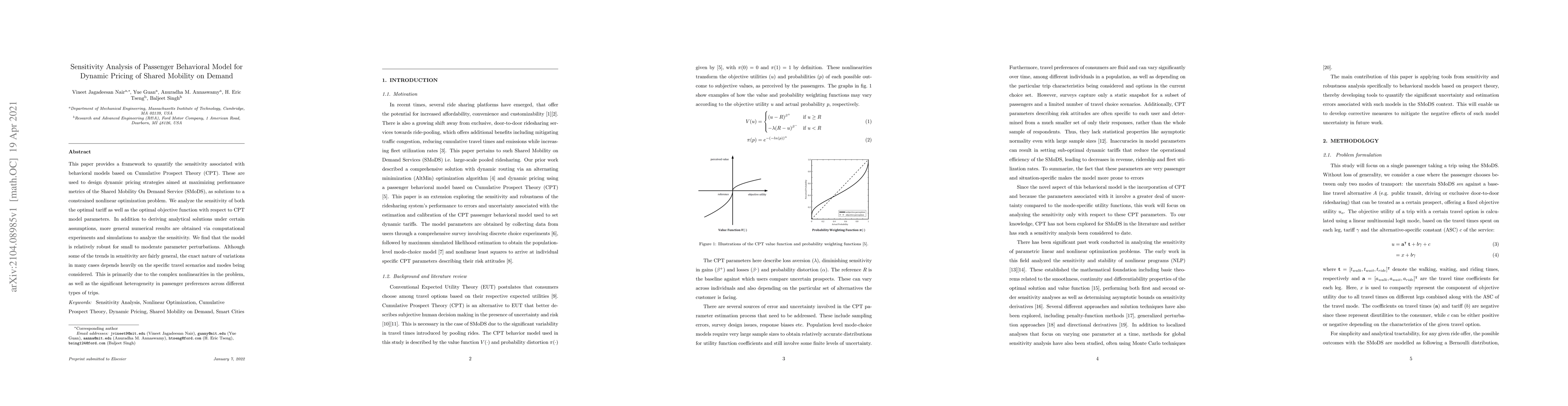 This paper provides a framework to quantify the sensitivity associated with behavioral models based on Cumulative Prospect Theory (CPT). These are used to design dynamic pricing strategies aimed at maximizing performance metrics of the Shared Mobility On-Demand Service (SMoDS), as solutions to a constrained nonlinear optimization problem. We analyze the sensitivity of both the optimal tariff as well as the optimal objective function with respect to CPT model parameters. In addition to deriving analytical solutions under certain assumptions, more general numerical results are obtained via computational experiments and simulations to analyze the sensitivity. We find that the model is relatively robust for small to moderate parameter perturbations. Although some of the trends in sensitivity are fairly general, the exact nature of variations in many cases depends heavily on the specific travel scenarios and modes being considered. This is primarily due to the complex nonlinearities in the problem, as well as the significant heterogeneity in passenger preferences across different types of trips.