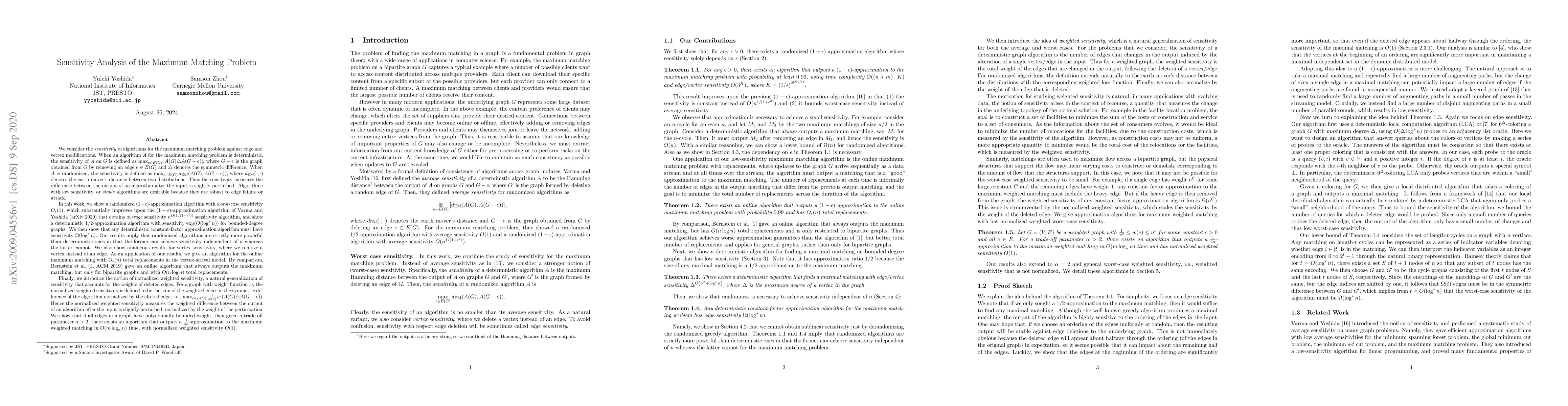 We consider the sensitivity of algorithms for the maximum matching problem against edge and vertex modifications. Algorithms with low sensitivity are desirable because they are robust to edge failure or attack. In this work, we show a randomized $(1-\epsilon)$-approximation algorithm with worst-case sensitivity $O_{\epsilon}(1)$, which substantially improves upon the $(1-\epsilon)$-approximation algorithm of Varma and Yoshida (arXiv 2020) that obtains average sensitivity $n^{O(1/(1+\epsilon^2))}$ sensitivity algorithm, and show a deterministic $1/2$-approximation algorithm with sensitivity $\exp(O(\log^*n))$ for bounded-degree graphs. We show that any deterministic constant-factor approximation algorithm must have sensitivity $\Omega(\log^* n)$. Our results imply that randomized algorithms are strictly more powerful than deterministic ones in that the former can achieve sensitivity independent of $n$ whereas the latter cannot. We also show analogous results for vertex sensitivity, where we remove a vertex instead of an edge. As an application of our results, we give an algorithm for the online maximum matching with $O_{\epsilon}(n)$ total replacements in the vertex-arrival model. By comparison, Bernstein et al. (J. ACM 2019) gave an online algorithm that always outputs the maximum matching, but only for bipartite graphs and with $O(n\log n)$ total replacements. Finally, we introduce the notion of normalized weighted sensitivity, a natural generalization of sensitivity that accounts for the weights of deleted edges. We show that if all edges in a graph have polynomially bounded weight, then given a trade-off parameter $\alpha>2$, there exists an algorithm that outputs a $\frac{1}{4\alpha}$-approximation to the maximum weighted matching in $O(m\log_{\alpha} n)$ time, with normalized weighted sensitivity $O(1)$. See paper for full abstract.