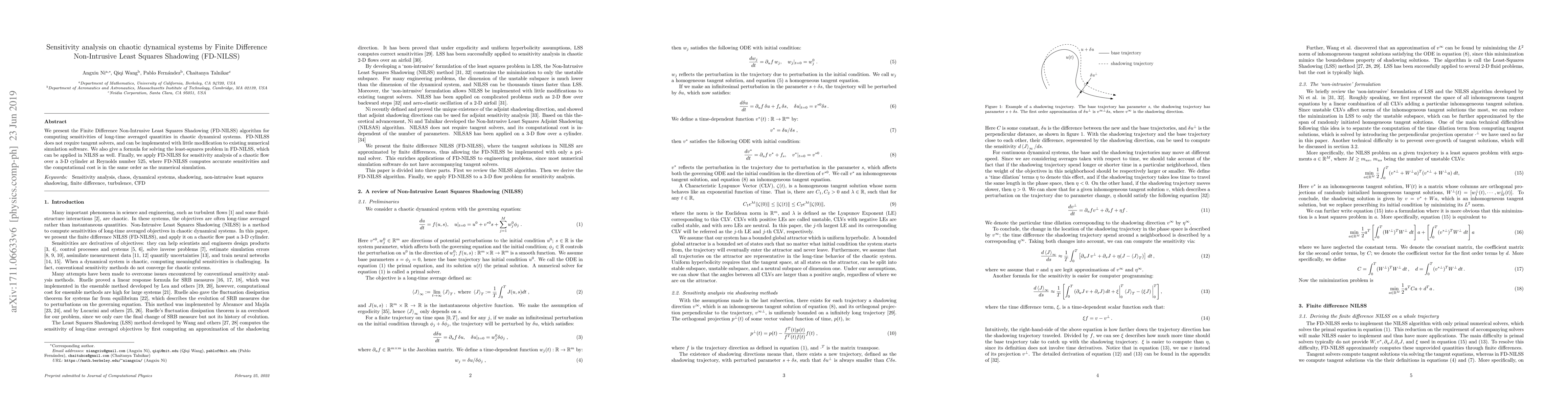 This paper introduces the FD-NILSS algorithm for sensitivity analysis in chaotic dynamical systems, requiring no tangent solvers and minimal software modifications. It demonstrates FD-NILSS's effectiveness through a sensitivity analysis on chaotic flow over a 3-D cylinder at Reynolds number 525, showing accurate results with comparable computational costs.