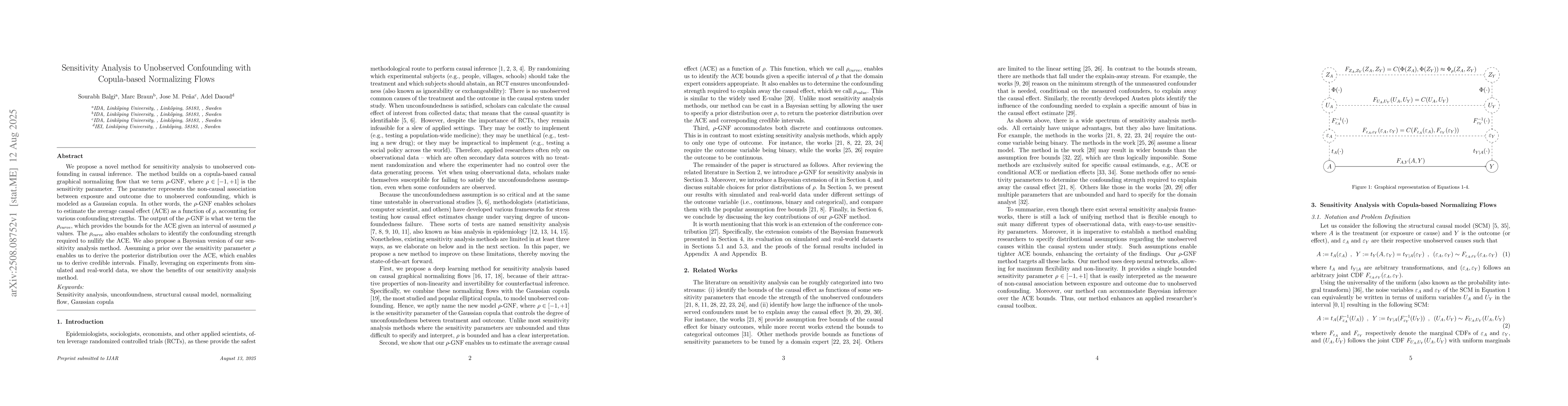 We propose a novel method for sensitivity analysis to unobserved confounding in causal inference. The method builds on a copula-based causal graphical normalizing flow that we term $\rho$-GNF, where $\rho \in [-1,+1]$ is the sensitivity parameter. The parameter represents the non-causal association between exposure and outcome due to unobserved confounding, which is modeled as a Gaussian copula. In other words, the $\rho$-GNF enables scholars to estimate the average causal effect (ACE) as a function of $\rho$, accounting for various confounding strengths. The output of the $\rho$-GNF is what we term the $\rho_{curve}$, which provides the bounds for the ACE given an interval of assumed $\rho$ values. The $\rho_{curve}$ also enables scholars to identify the confounding strength required to nullify the ACE. We also propose a Bayesian version of our sensitivity analysis method. Assuming a prior over the sensitivity parameter $\rho$ enables us to derive the posterior distribution over the ACE, which enables us to derive credible intervals. Finally, leveraging on experiments from simulated and real-world data, we show the benefits of our sensitivity analysis method.