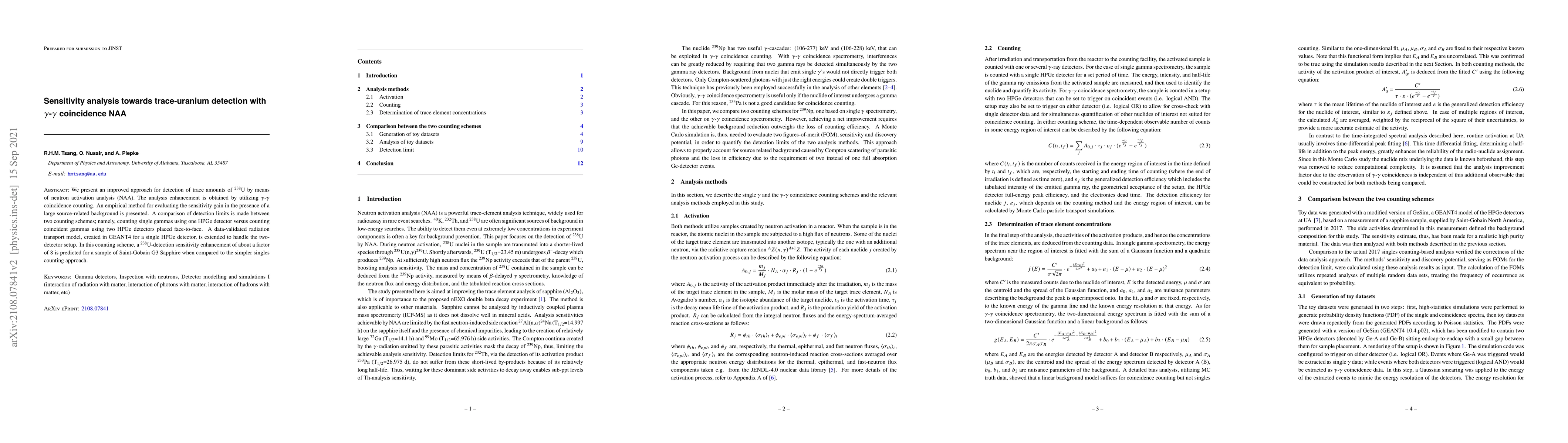 We present an improved approach for detection of trace amounts of $^{238}$U by means of neutron activation analysis (NAA). The analysis enhancement is obtained by utilizing $\gamma$-$\gamma$ coincidence counting. An empirical method for evaluating the sensitivity gain in the presence of a large source-related background is presented. A comparison of detection limits is made between two counting schemes; namely, counting single gammas using one HPGe detector versus counting coincident gammas using two HPGe detectors placed face-to-face. A data-validated radiation transport model, created in GEANT4 for a single HPGe detector, is extended to handle the two-detector setup. In this counting scheme, a $^{238}$U-detection sensitivity enhancement of about a factor of 8 is predicted for a sample of Saint-Gobain G3 Sapphire when compared to the simpler singles counting approach.
