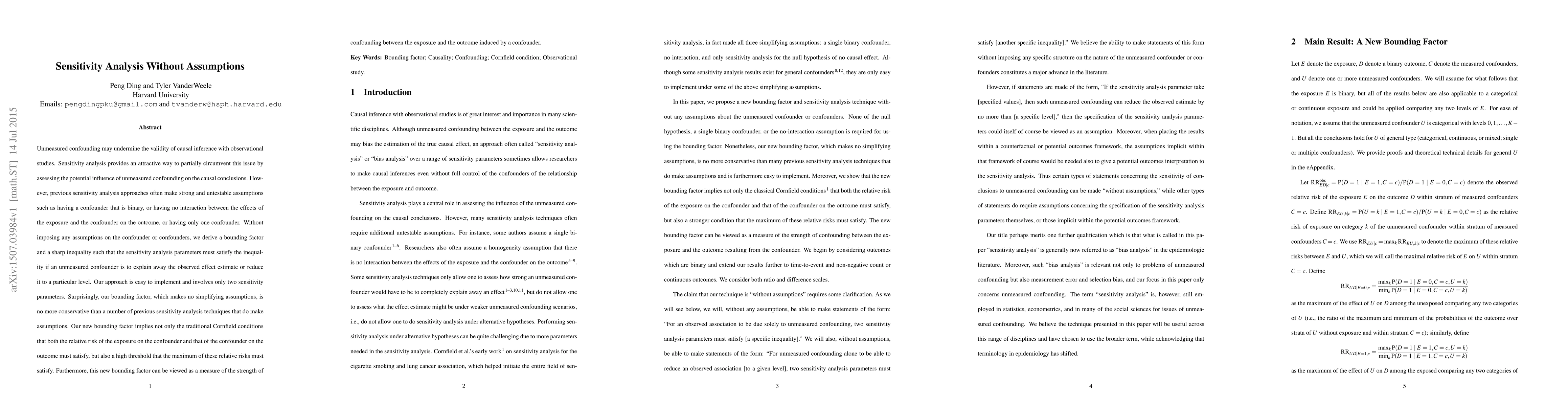 This paper proposes a novel sensitivity analysis method for observational studies that does not rely on strong, untestable assumptions about unmeasured confounders. The new bounding factor derived is as effective as previous methods but without the need for assumptions, providing a robust measure of confounding strength.
