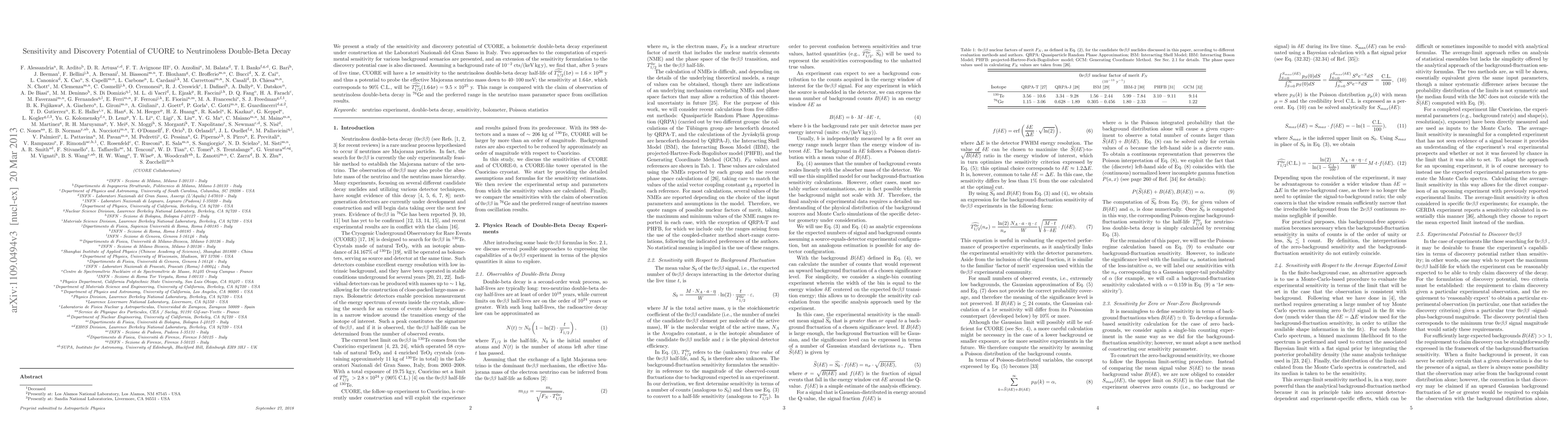 CUORE's sensitivity to neutrinoless double-beta decay is shown to be 1.6 x 10^26 years at a 1 sigma confidence level, allowing it to probe the effective Majorana neutrino mass down to 40-100 meV.