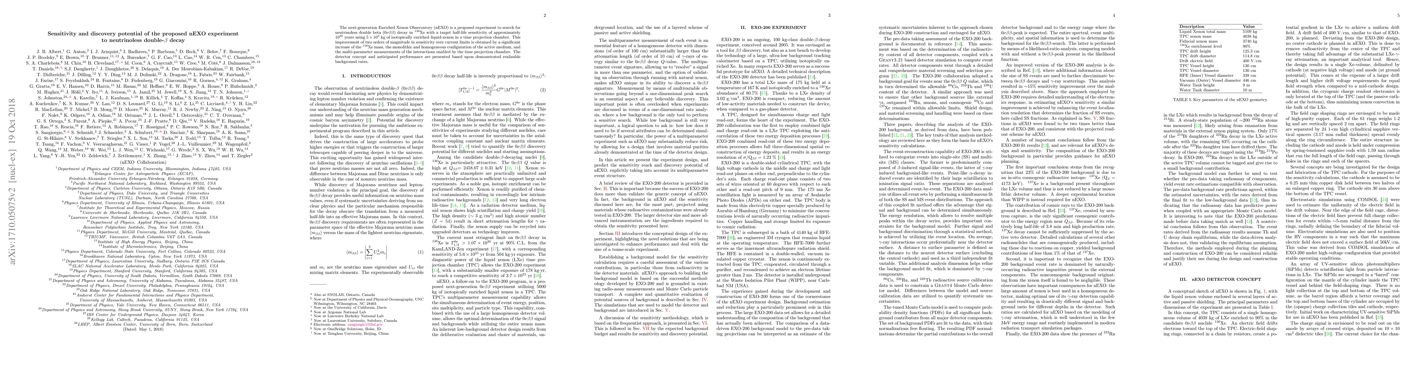 The nEXO experiment aims to detect neutrinoless double beta decay with a target half-life sensitivity of 10^28 years, improving on current limits by two orders of magnitude through increased xenon mass and multi-parameter measurements.