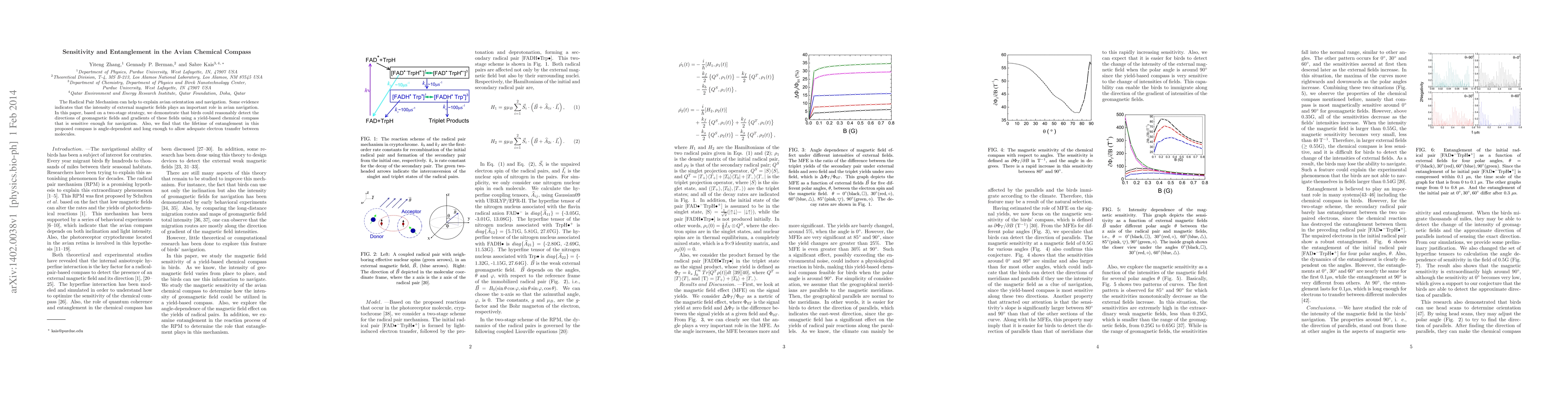 This paper demonstrates that birds use a yield-based chemical compass based on the Radical Pair Mechanism to detect geomagnetic fields and their gradients for navigation, and finds that the entanglement lifetime in this mechanism is angle-dependent but sufficiently long for effective electron transfer.