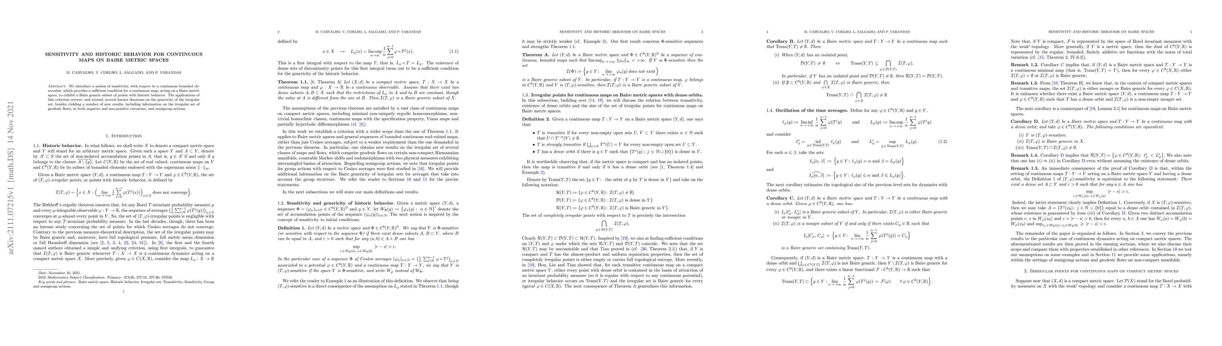We introduce a notion of sensitivity, with respect to a continuous bounded observable, which provides a sufficient condition for a continuous map, acting on a Baire metric space, to exhibit a Baire generic subset of points with historic behavior. The applications of this criterion recover, and extend, several known theorems on the genericity of the irregular set, besides yielding a number of new results, including information on the irregular set of geodesic flows, in both negative and non-positive curvature, and semigroup actions.
