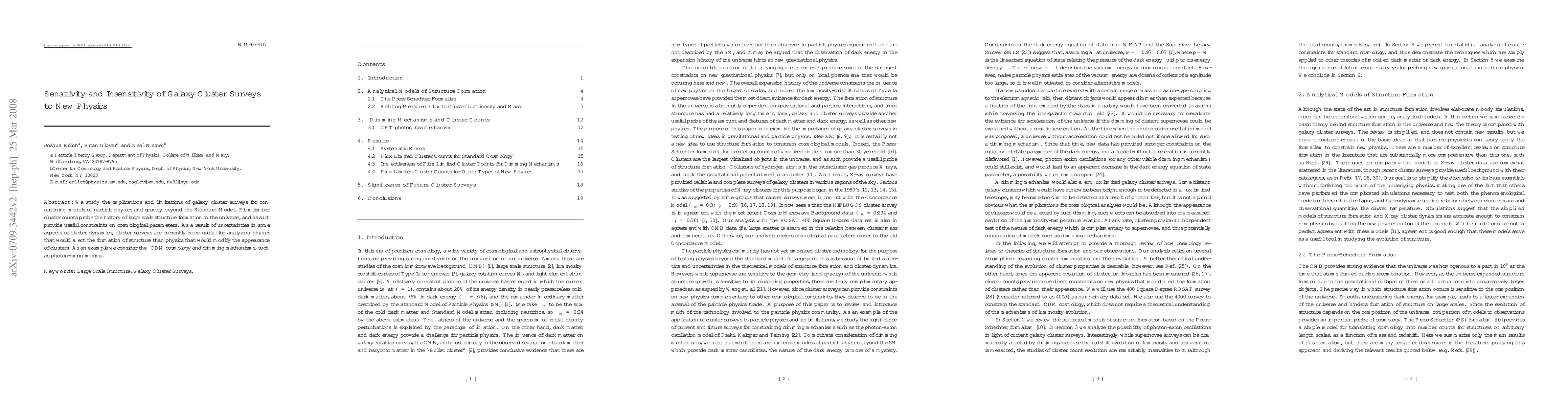 We study the implications and limitations of galaxy cluster surveys for constraining models of particle physics and gravity beyond the Standard Model. Flux limited cluster counts probe the history of large scale structure formation in the universe, and as such provide useful constraints on cosmological parameters. As a result of uncertainties in some aspects of cluster dynamics, cluster surveys are currently more useful for analyzing physics that would affect the formation of structure than physics that would modify the appearance of clusters. As an example we consider the Lambda-CDM cosmology and dimming mechanisms, such as photon-axion mixing.